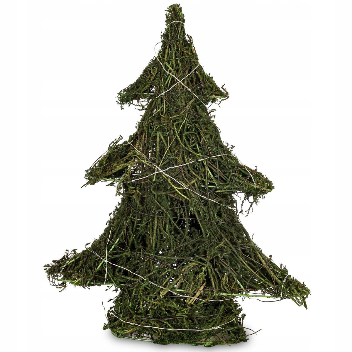 - Kształt i Konstrukcja: Choinka ma klasyczny, trójkątny kształt z wyraźnie zaznaczonymi poziomami gałęzi, osiągając 40 cm wysokości. Jej struktura jest zbudowana na stelażu, który został gęsto obłożony naturalnymi lub sztucznymi gałązkami i mchem w ciemnej, naturalnej zieleni. Całość jest dodatkowo owinięta cienkim, białym sznurkiem lub drutem, który pomaga utrzymać kształt i dodaje rustykalnego uroku.