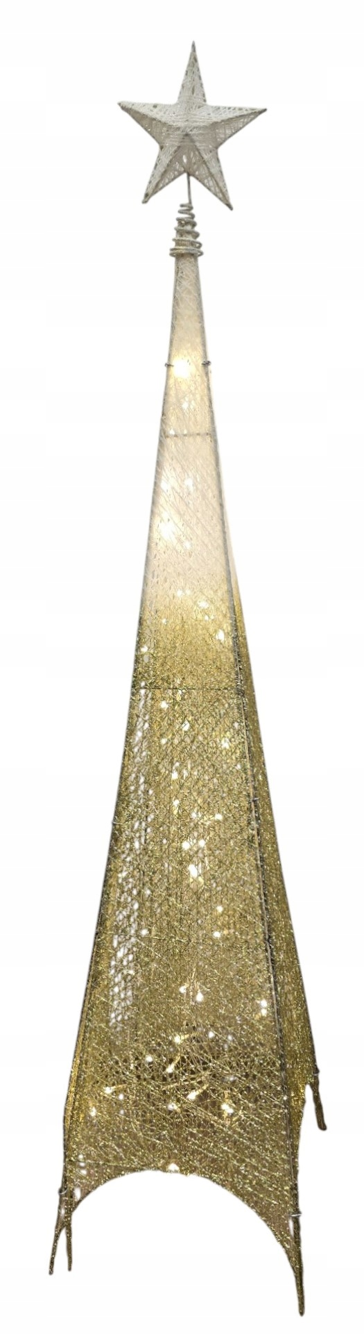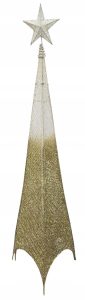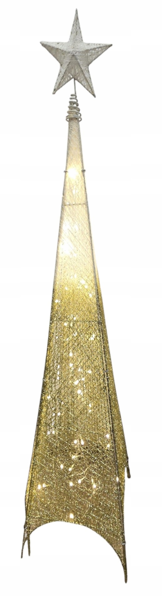 Najważniejszym elementem jest zintegrowane, ciepłe oświetlenie LED, które migocze niczym gwiazdy w zimową noc. Światełka prześwitują przez siatkę złotych włókien, tworząc hipnotyzujący spektakl blasku i cienia. Całość wieńczy piękna, brokatowa Gwiazda Betlejemska, stabilnie umieszczona na sprężynie.