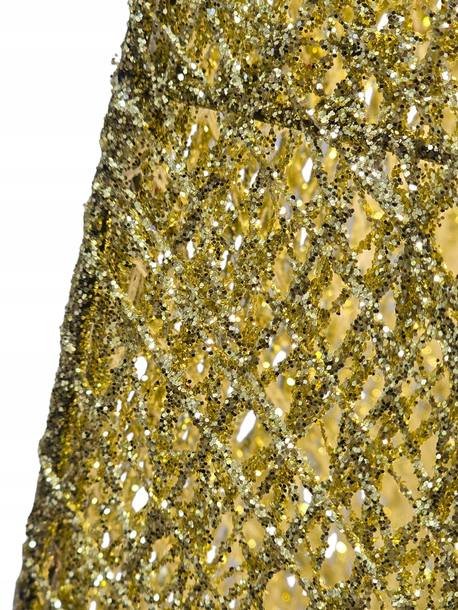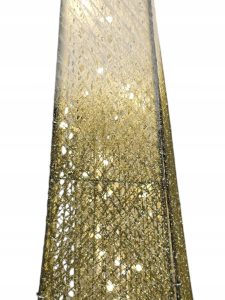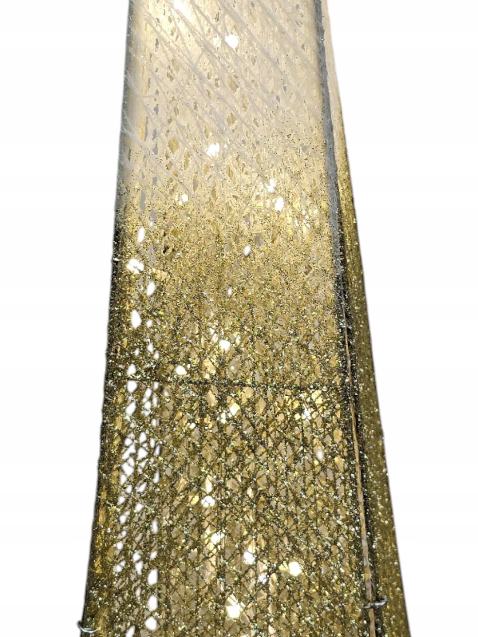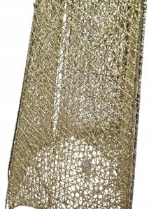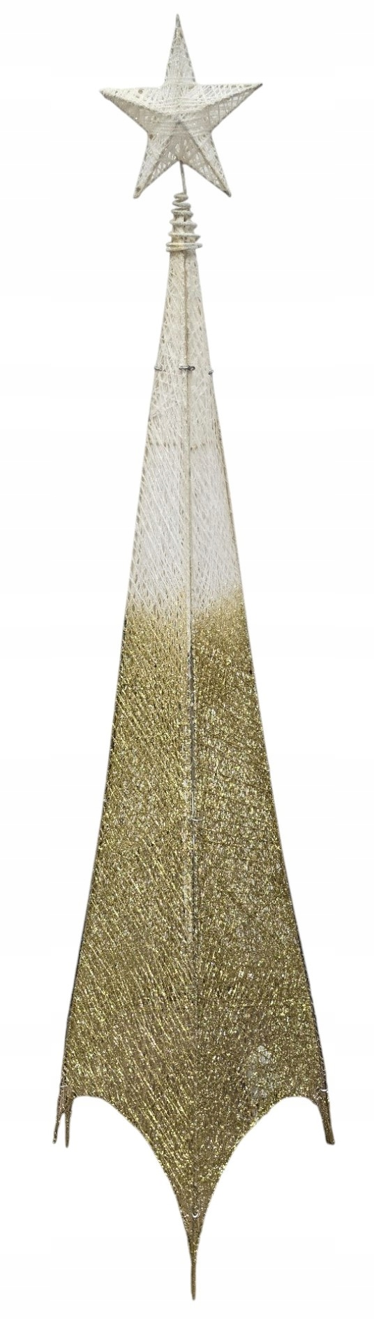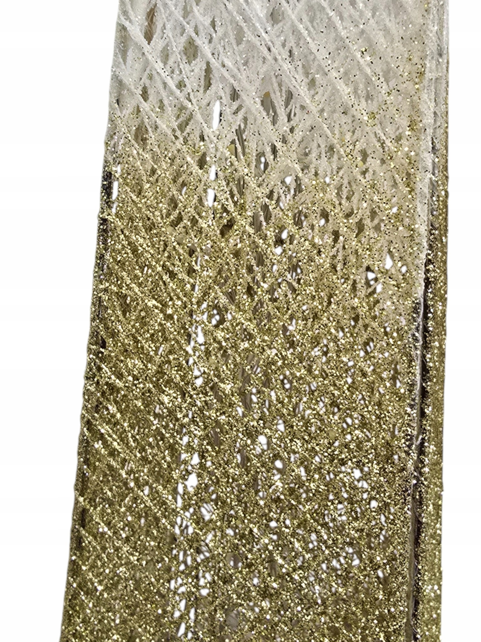 Choinka wyróżnia się unikatowym efektem Ombre (cieniowania): od szczytu w kolorze delikatnej bieli lub srebra, przechodzi płynnie do podstawy mieniącej się bogactwem złotego brokatu. Cała konstrukcja jest stworzona z misternie splecionych włókien, które nadają dekoracji lekką, ażurową formę.
