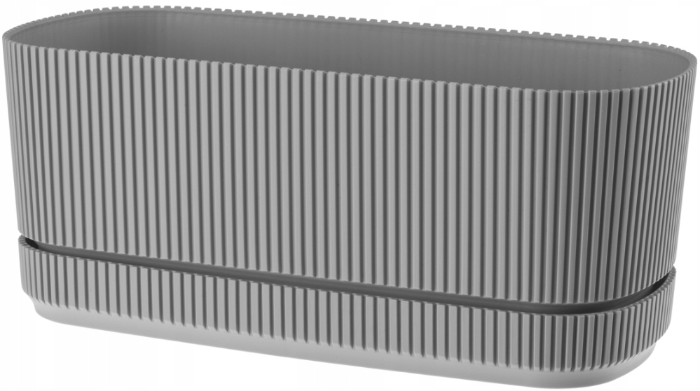 Odkryj elegancję nowoczesnego designu z tą owalną doniczką wykonaną z wysokiej jakości tworzywa w stylowym, matowym szarym. Jej tłoczona struktura dodaje subtelności, a owalny kształt idealnie sprawdzi się na parapecie, eksponując rośliny w jednej linii. Dedykowana podstawka z wypustkami gwarantuje stabilne połączenie obu elementów.