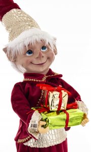 Elf ubrany jest w elegancki, aksamitny kostium w kolorze głębokiej zieleni, ozdobiony złotymi łańcuszkami i białym futerkiem. Charakterystyczny, długi kapelusz i mankiety zdobią lśniące, złoto-białe wzory. W rękach trzyma starannie zapakowane prezenty, gotowe do wręczenia.