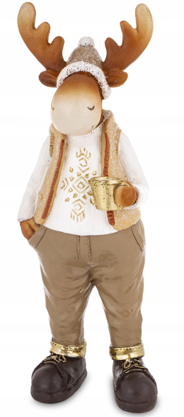 Przedstawiamy figurkę, która łączy w sobie skandynawski urok z nutą przytulnego, świątecznego glamour! Ten stojący Łoś, ubrany w modny zimowy strój i popijający złoty kubek, to idealny akcent do stworzenia ciepłej i stylowej aranżacji.