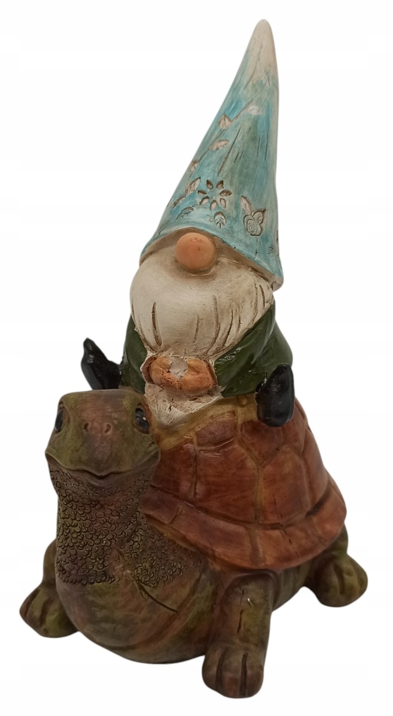 Figurka została wykonana z dbałością o najdrobniejsze szczegóły, co sprawia, że wygląda niezwykle uroczo i zachęcająco. Skrzat, z charakterystyczną, błękitno-zieloną spiczastą czapką (zdobioną delikatnymi wzorami roślinnymi), długą białą brodą i zielonym płaszczem, siedzi swobodnie na grzbiecie żółwia o realistycznie odwzorowanej brązowej skorupie i zielonkawym ciele. Delikatne cieniowanie i tekstura nadają figurce autentyczny, a jednocześnie bajkowy wygląd. Spokojna postać żółwia i wesoły wyraz skrzata tworzą urokliwą kompozycję.