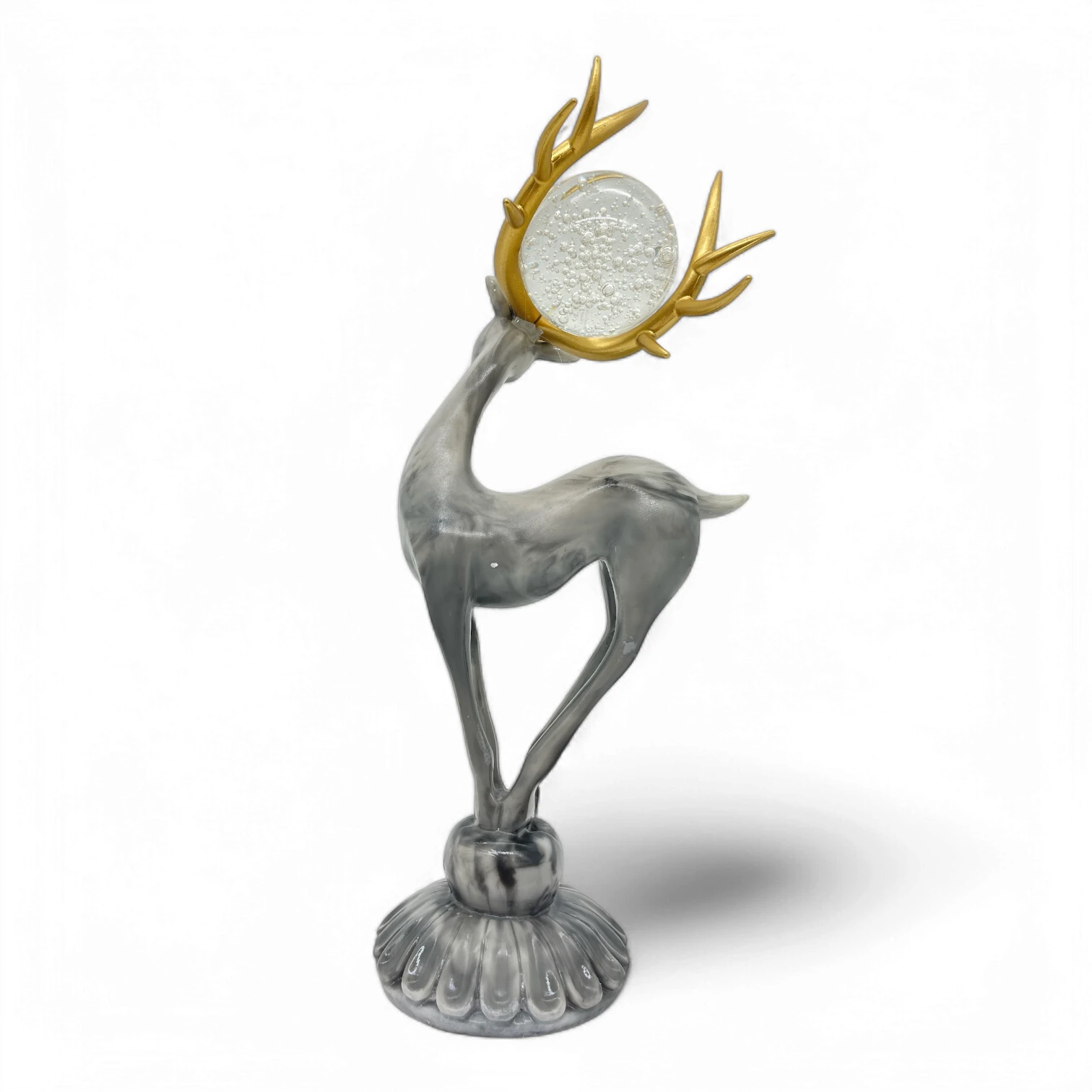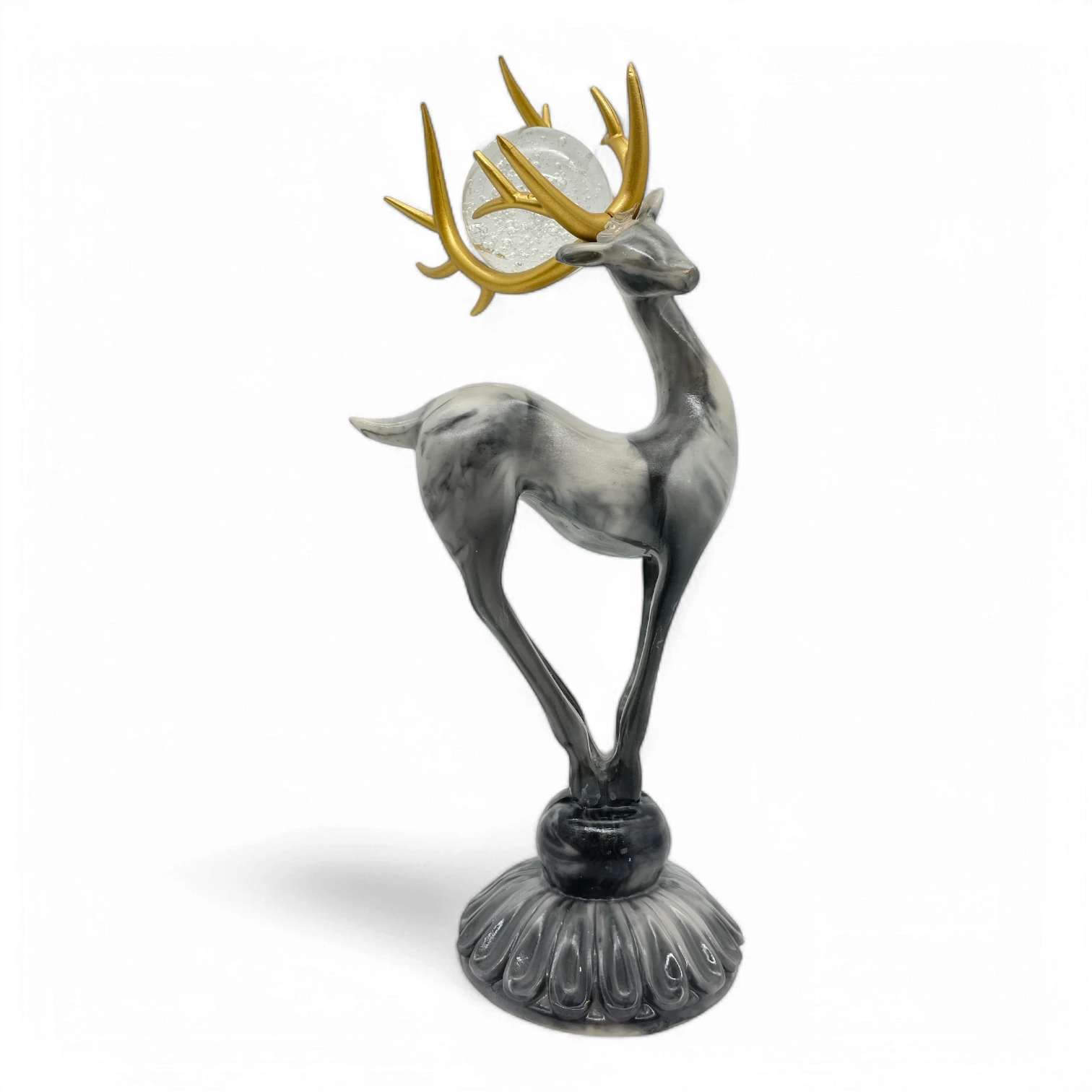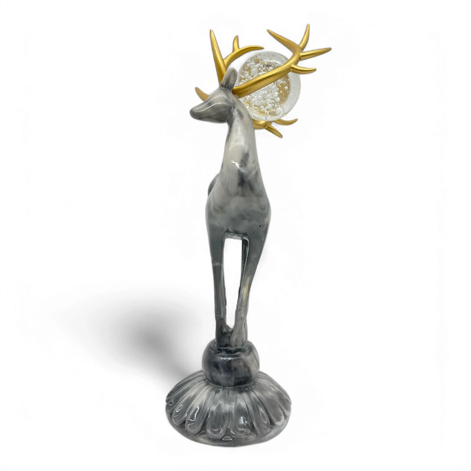 Postać jelenia, patrzącego w prawo, symbolizuje spokojną determinację. Marmurowa faktura jest nie tylko estetyczna, ale też realistyczna. Dzięki przezroczystej szklanej kuli, jeleń nie tylko zyskuje równowagę, ale również emanuje urokiem, przypominając o elegancji, która wyróżnia twój styl.