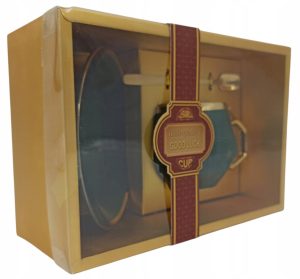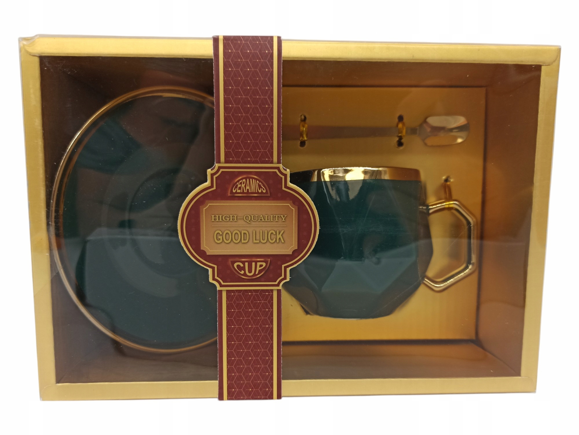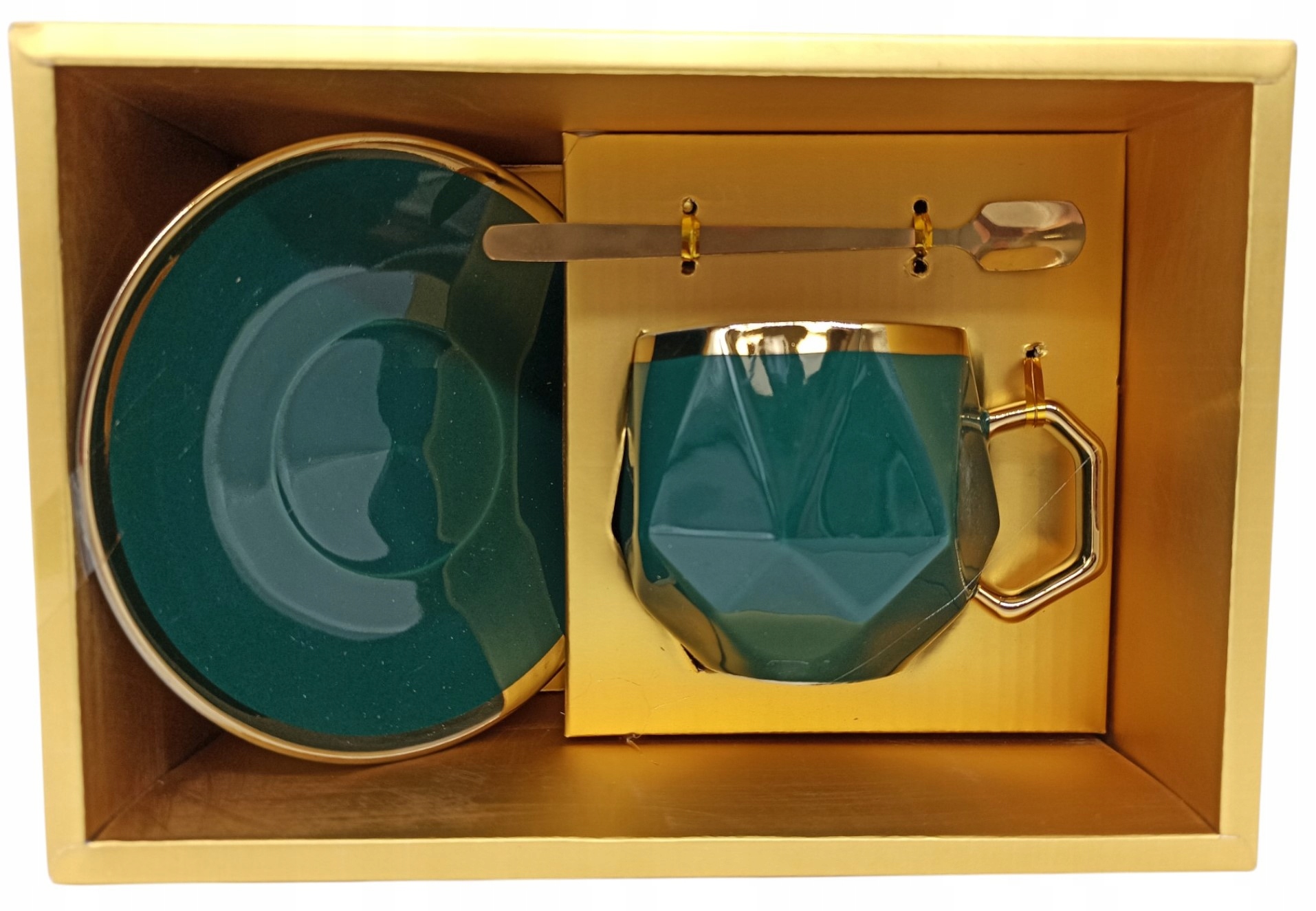 Filiżanka, spodek oraz łyżeczka są wykonane z wysokiej jakości materiałów. Filiżanka w kolorze głębokiej zieleni ze złotym wykończeniem oraz złotym uszkiem, prezentuje się niezwykle elegancko i stylowo. Spodek w tym samym kolorze idealnie komponuje się z filiżanką. Zestaw zawiera również złotą łyżeczkę, która stanowi szykowny akcent. Pudełko prezentowe w kolorze złotym z ozdobną wstążką, sprawia, że to idealny upominek na każdą okazję.