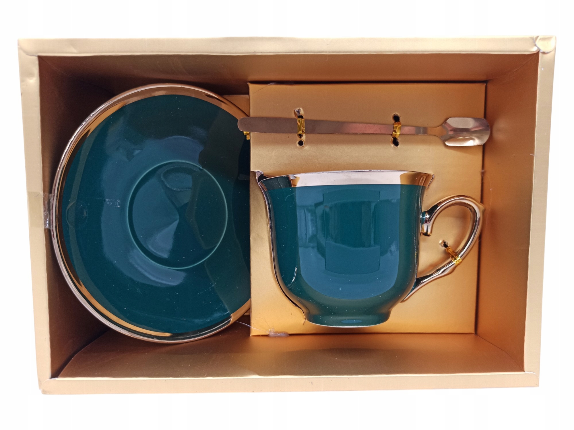 Filiżanka, spodek oraz łyżeczka są wykonane z wysokiej jakości materiałów. Filiżanka w kolorze głębokiej zieleni ze złotym wykończeniem oraz złotym uszkiem, prezentuje się niezwykle elegancko i stylowo. Spodek w tym samym kolorze idealnie komponuje się z filiżanką. Zestaw zawiera również złotą łyżeczkę, która stanowi szykowny akcent. Pudełko prezentowe w kolorze złotym z ozdobną wstążką, sprawia, że to idealny upominek na każdą okazję.