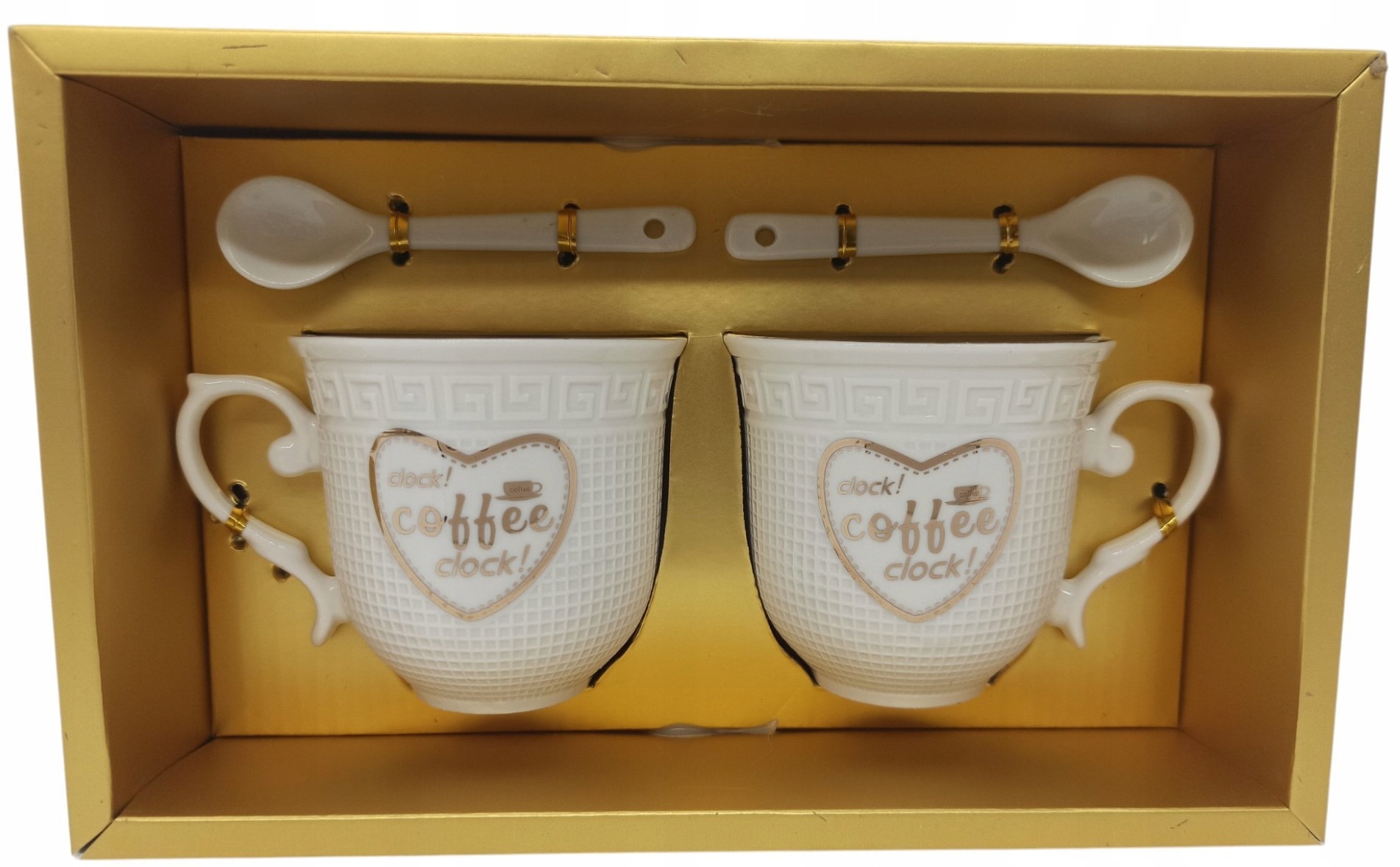 Filiżanki wykonane są z wysokiej jakości ceramiki w kolorze białym, ozdobionej delikatnym, złotym wzorem. Na środku każdego kubka znajduje się ozdobne serce ze złotym napisem „Coffee”. Do zestawu dołączone są dwie łyżeczki, również ceramiczne, ze złotymi akcentami. Całość zapakowana jest w złote, ozdobne pudełko, gotowe do wręczenia na prezent.