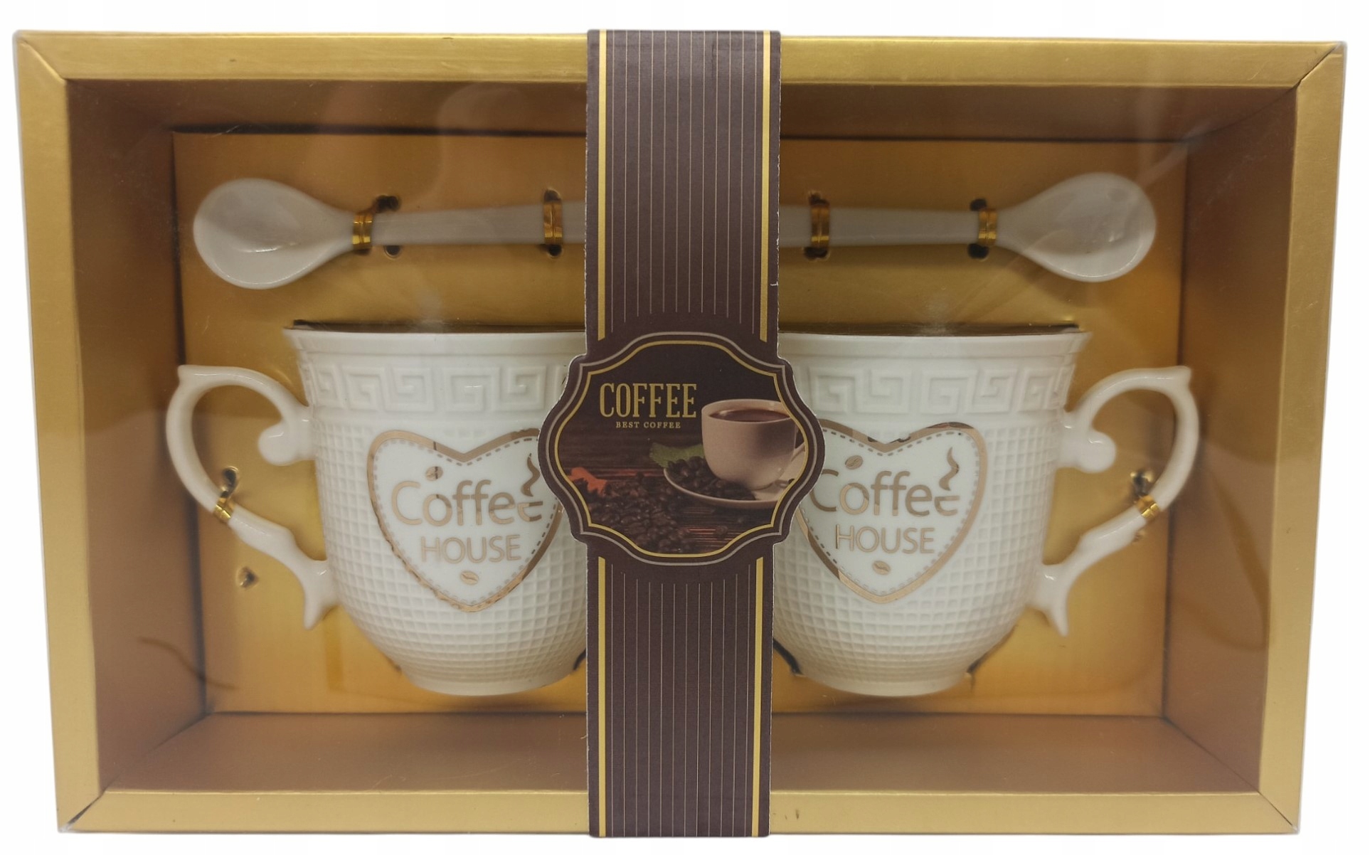 Filiżanki wykonane są z wysokiej jakości ceramiki w kolorze białym, ozdobionej delikatnym, złotym wzorem. Na środku każdego kubka znajduje się ozdobne serce ze złotym napisem „Coffee”. Do zestawu dołączone są dwie łyżeczki, również ceramiczne, ze złotymi akcentami. Całość zapakowana jest w złote, ozdobne pudełko, gotowe do wręczenia na prezent.