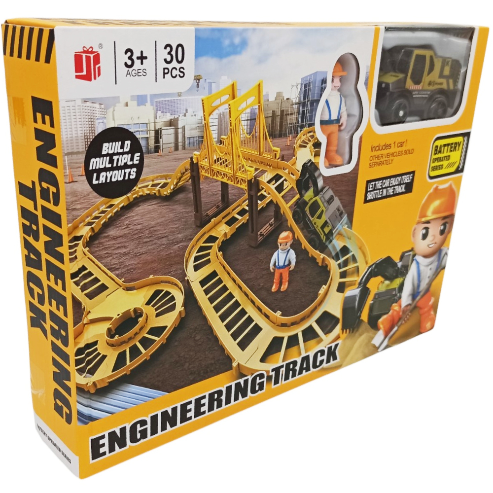- Kompletny Zestaw 30 Elementów: Zawiera liczne elementy toru, autko budowlane, figurki oraz akcesoria, co pozwala na budowanie zróżnicowanych i rozbudowanych konstrukcji.