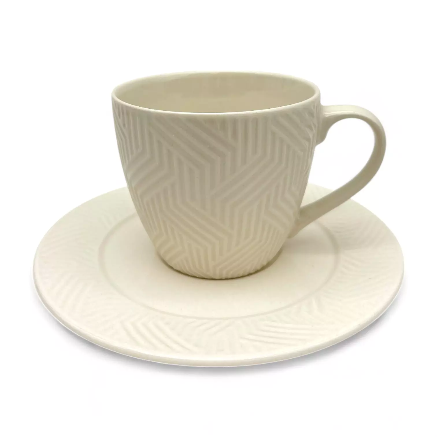 Odkryj nowoczesny urok filiżanek i talerzyków w jasno kremowym kolorze z geometrycznym motywem. Wykonanie z ceramiki zapewnia trwałość i łatwość w czyszczeniu, dzięki czemu stają się niezastąpionym elementem codziennego użytku. Każda kawa czy herbata zyskuje nowy wymiar elegancji!