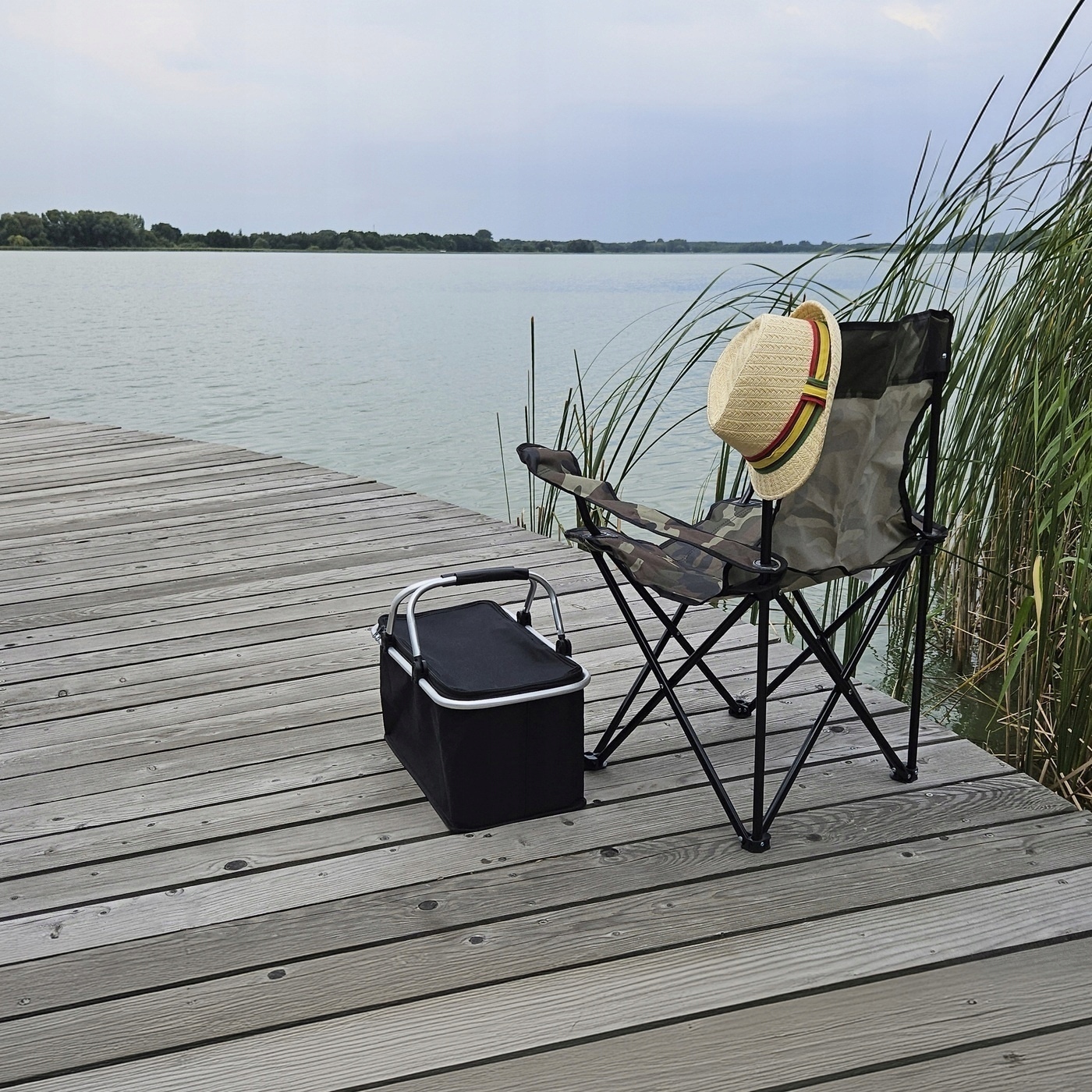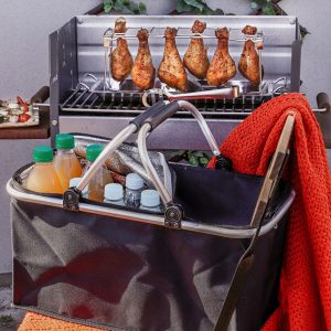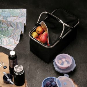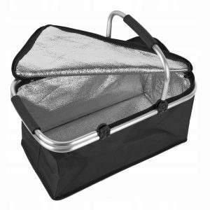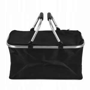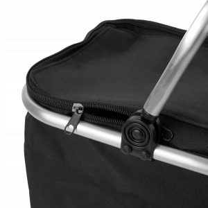 Metalowy stelaż jest lekki, a więc też odpowiednio komfortowy w przenoszeniu. Kosz piknikowy ma dwa duże uchwyty i jest materiałowy. Od wewnątrz posiada warstwę termoizolacyjną, która zadba przez kilka godzin o świeżość zabranego jedzenia. Model z zamknięciem zapinanym na zamek błyskawiczny.