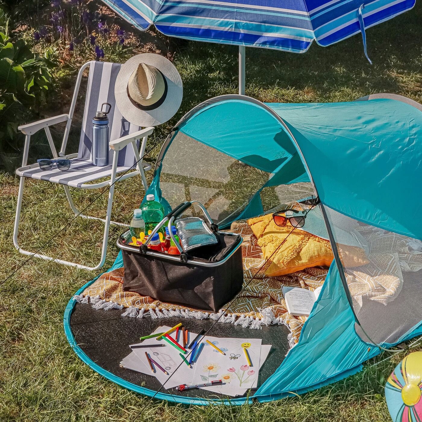 Sprawdzi się również podczas wypoczynku nad jeziorem lub morzem. Jego konstrukcja jest składana, więc łatwo można go przechowywać.