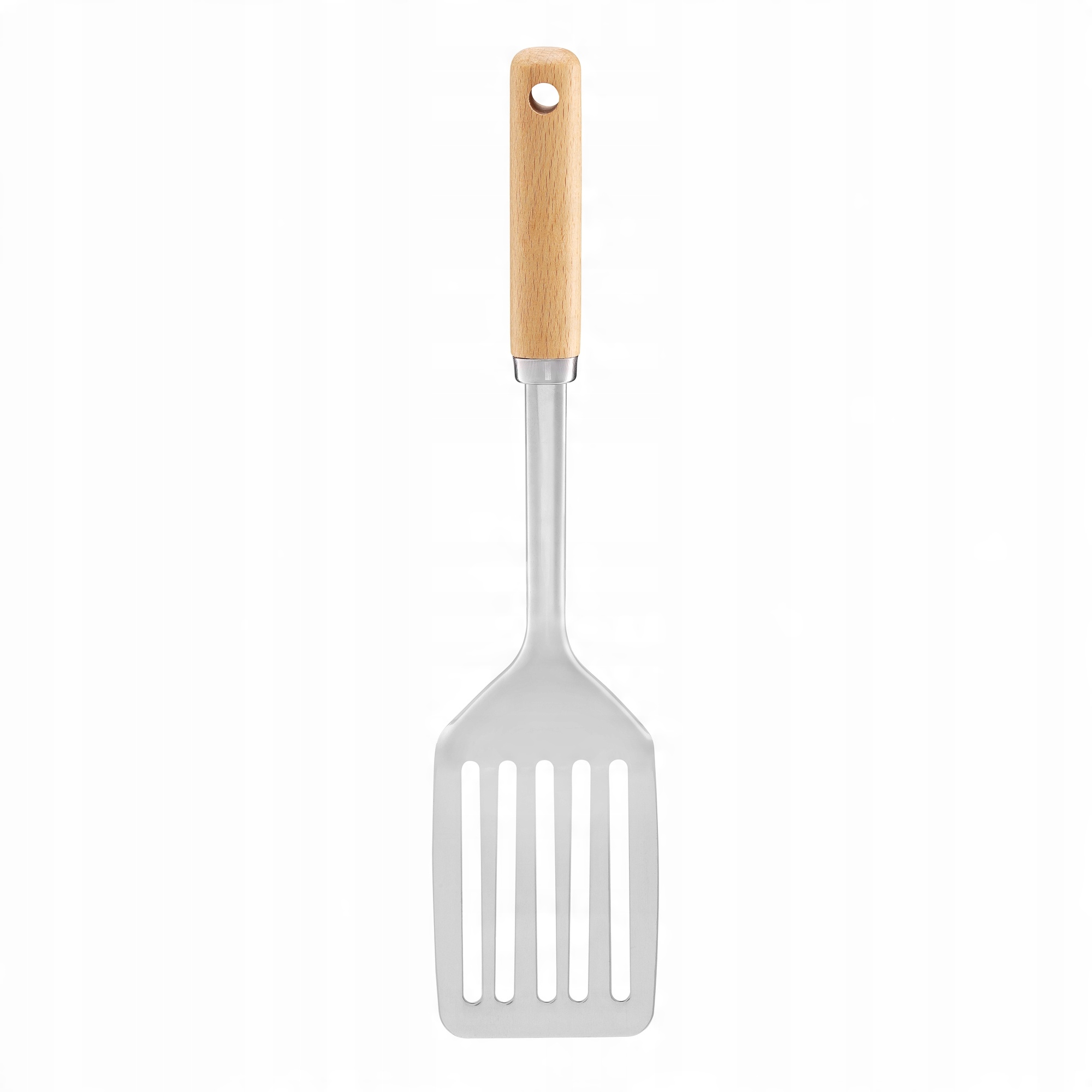 Kuchenna łopatka ażurowa z kolekcji Natural to artykuł przydatny w każdej kuchni. Niezbędna do przekładania i nakładania na talerz ryb i mięsa. Wykonana ze stali oraz drewna bukowego, które idealnie sprawdzi się w kuchni. Jest to materiał solidny i trwały, dzięki czemu szpatułka posłuży przez bardzo długi czasu. Rękojeść z bukowego drewna pewnie leży w dłoni. Dzięki temu zapewnia precyzję podczas przygotowywania ciasta.