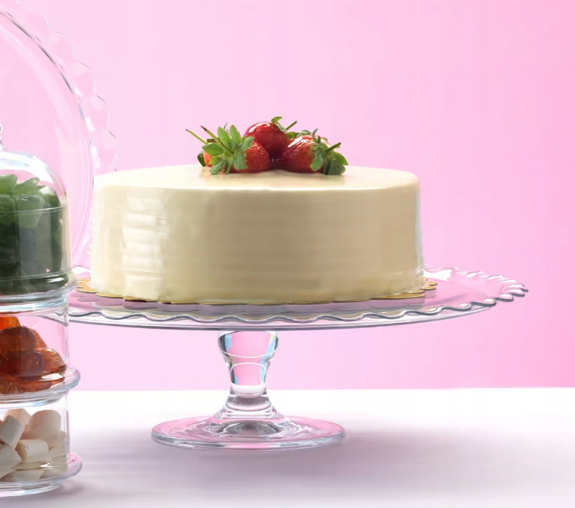 Szklana patera, która pozwoli Ci na eleganckie podanie ciast, owoców oraz innych przekąsek. Patera składa się z talerza o średnicy 26 cm, który pomieści tort bądź inne przysmaki w zależności od okazji.