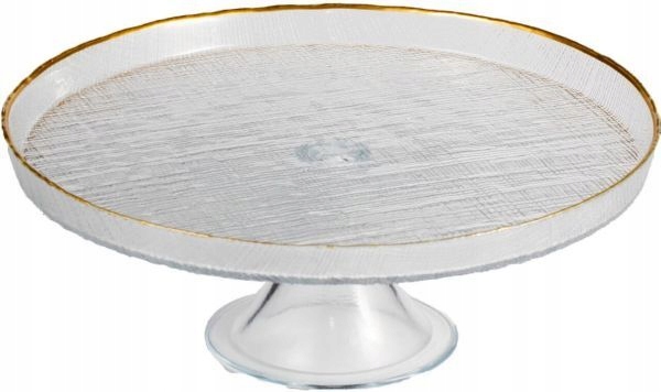 Najbardziej efektownym detalem jest elegancki, złoty rant, który otacza całą krawędź patery, dodając jej blasku i ekskluzywnego wyglądu. Złoty akcent wspaniale komponuje się z przezroczystością szkła, tworząc harmonijną całość. Patera osadzona jest na stabilnej, szklanej podstawie, która zapewnia jej bezpieczeństwo i elegancki wygląd na każdym blacie.