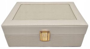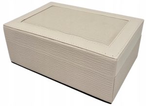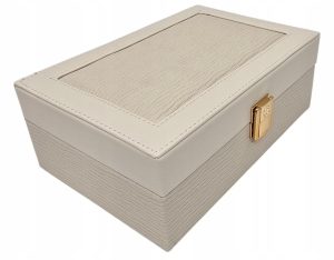 Szkatułka wykonana jest z wysokiej jakości ekoskóry w subtelnym, beżowym kolorze, a jej wnętrze wyściełane jest miękkim welurem. Złote zapięcie dodaje jej luksusowego charakteru, a solidna konstrukcja gwarantuje trwałość na lata.