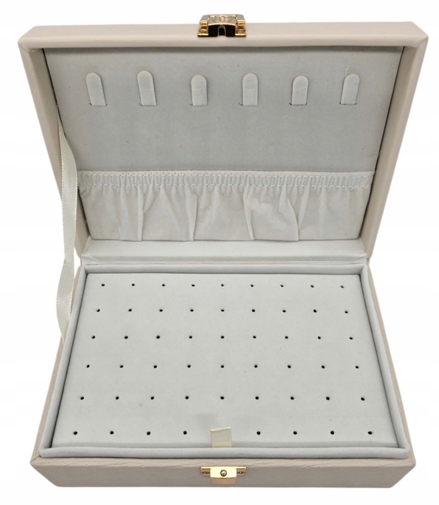 - Wielopoziomowa organizacja: Na górze szkatułki znajduje się miejsce na łańcuszki, a specjalna perforowana płytka na kolczyki, dzięki czemu Twoja biżuteria nie będzie się plątać.
