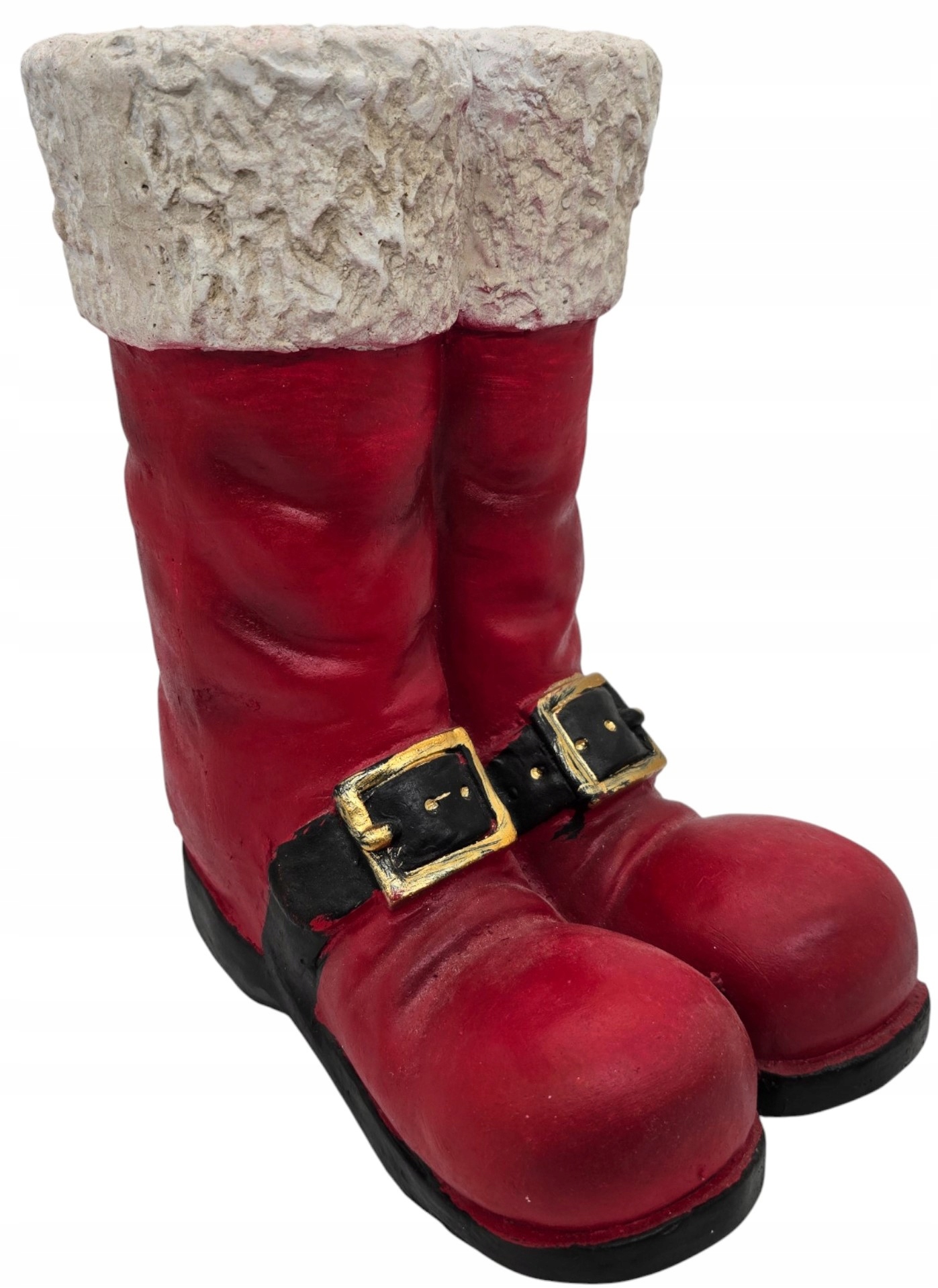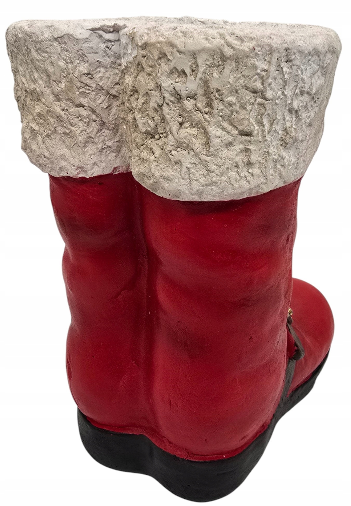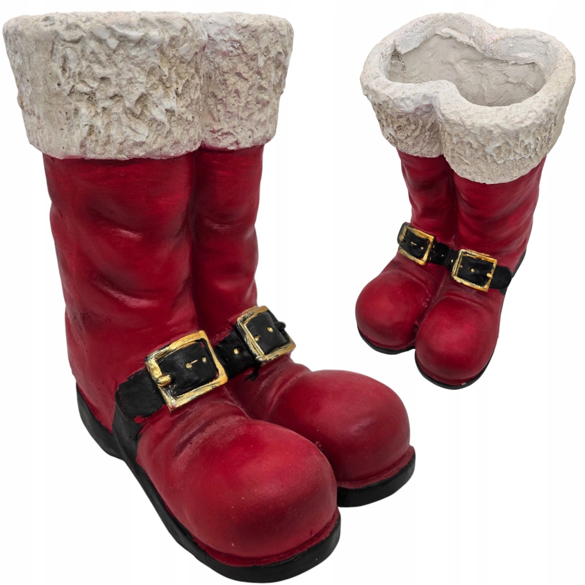 Figurka została wykonana z solidnego materiału ceramicznego, który doskonale przypomina gips, nadając jej rustykalny, a jednocześnie elegancki charakter. Intensywna czerwień butów z dbałością o detale, takie jak czarne paski ze złotymi klamrami, kontrastuje z białą, chropowatą „futrzaną” cholewą, która dodaje całości autentyczności. Wnętrze butów jest wydrążone, co pozwala na wykorzystanie figurki jako oryginalnej doniczki na gwiazdę betlejemską, stroika, lub jako pojemnika na świąteczne słodycze czy drobne upominki.
