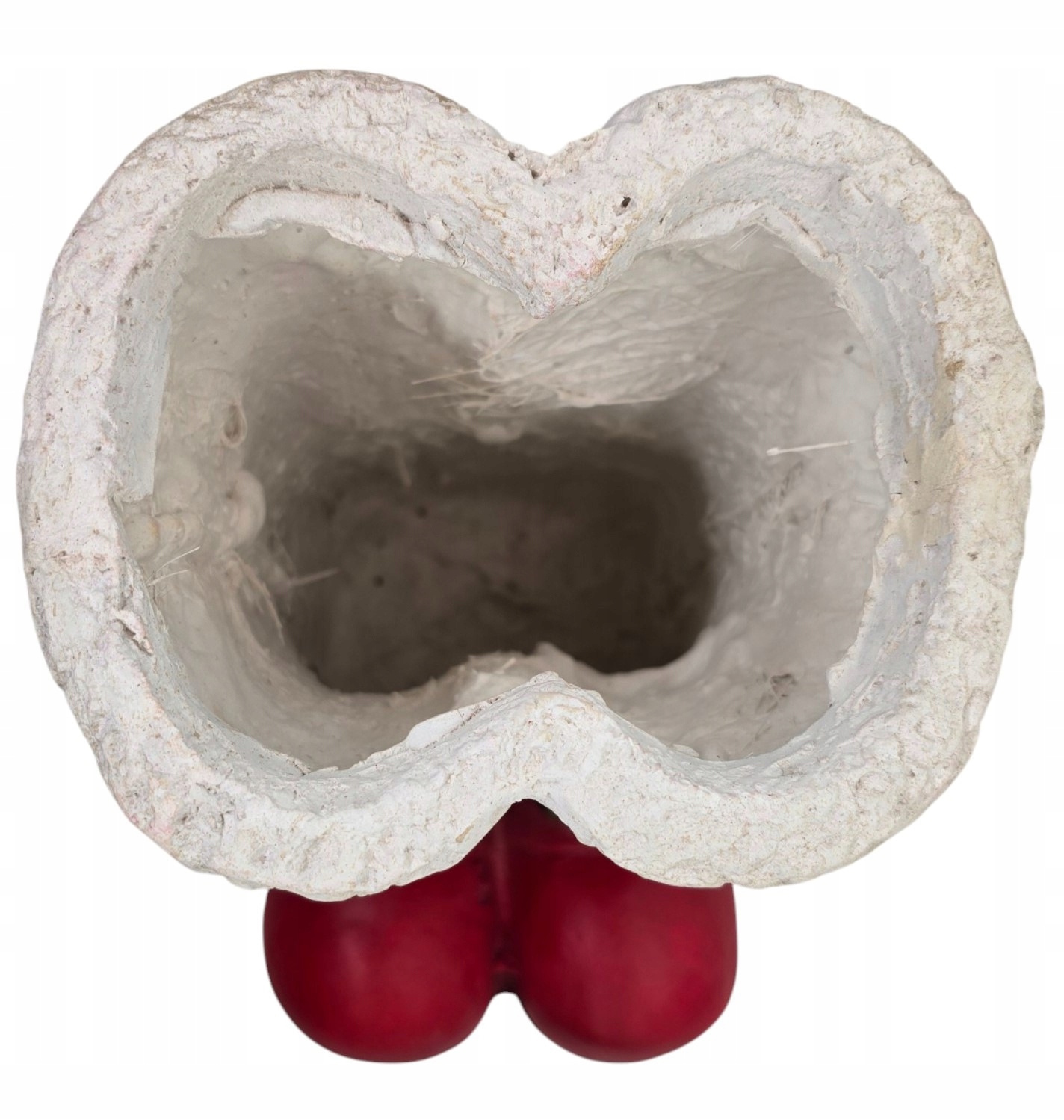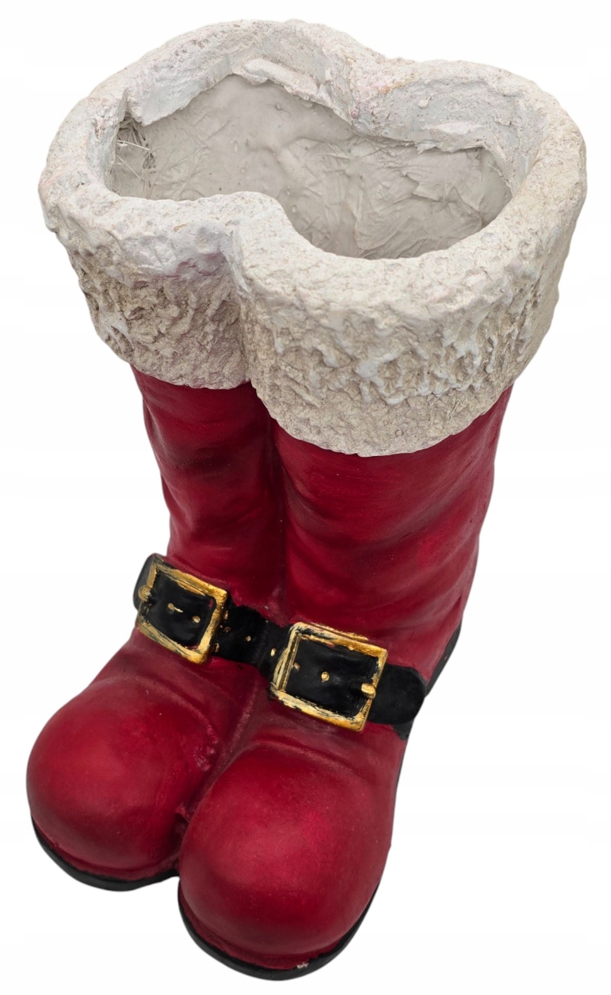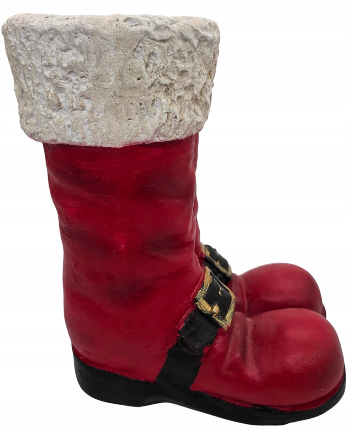 Figurka została wykonana z solidnego materiału ceramicznego, który doskonale przypomina gips, nadając jej rustykalny, a jednocześnie elegancki charakter. Intensywna czerwień butów z dbałością o detale, takie jak czarne paski ze złotymi klamrami, kontrastuje z białą, chropowatą „futrzaną” cholewą, która dodaje całości autentyczności. Wnętrze butów jest wydrążone, co pozwala na wykorzystanie figurki jako oryginalnej doniczki na gwiazdę betlejemską, stroika, lub jako pojemnika na świąteczne słodycze czy drobne upominki.