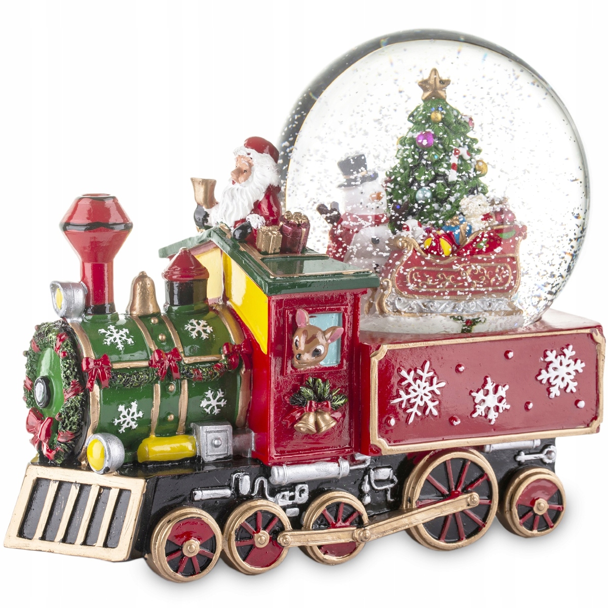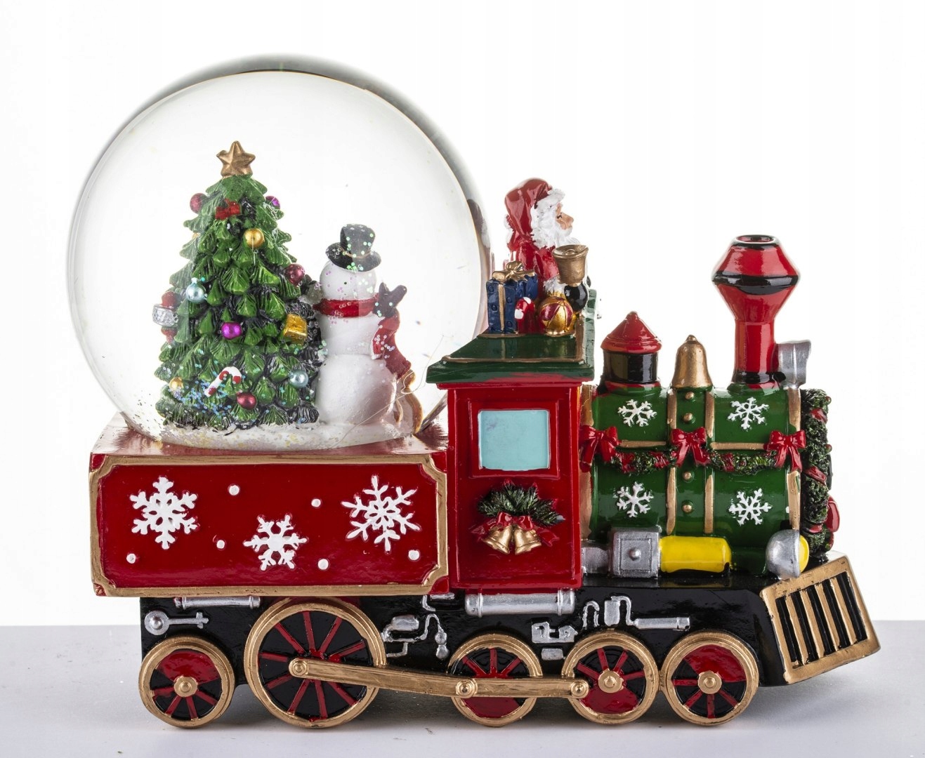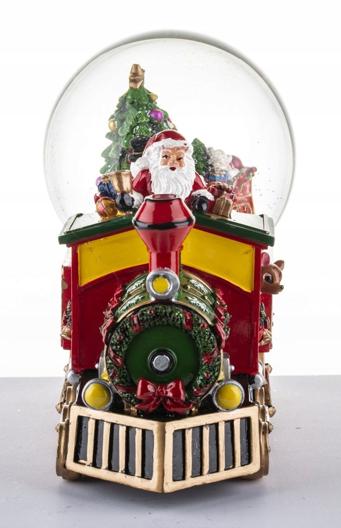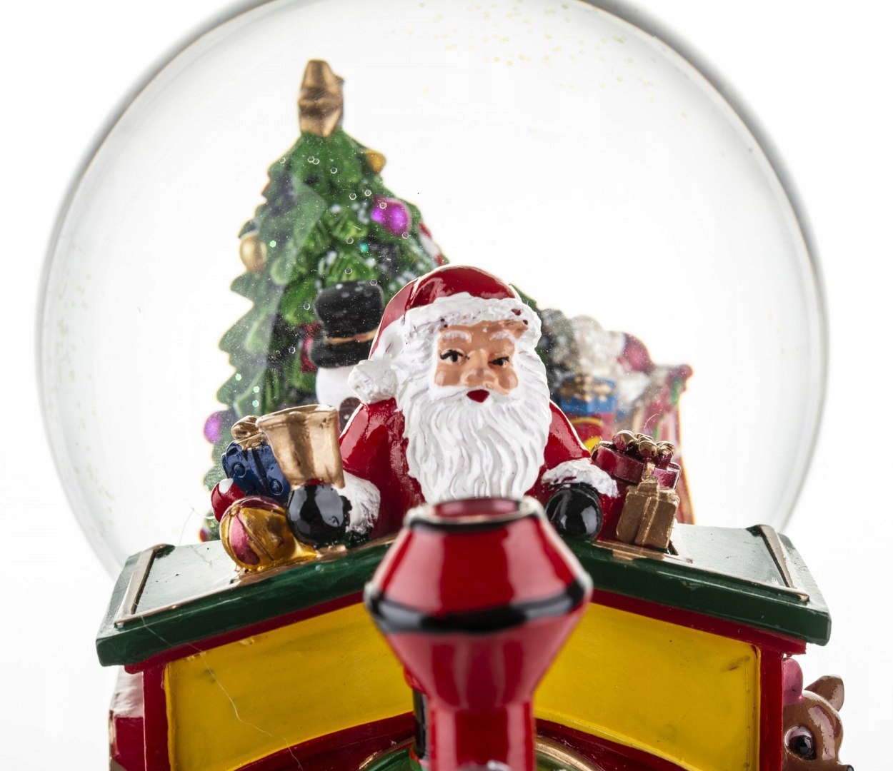 - Wyjątkowa Sceneria: Realistyczna, świąteczna scena z Mikołajem i lokomotywą wewnątrz kuli.
