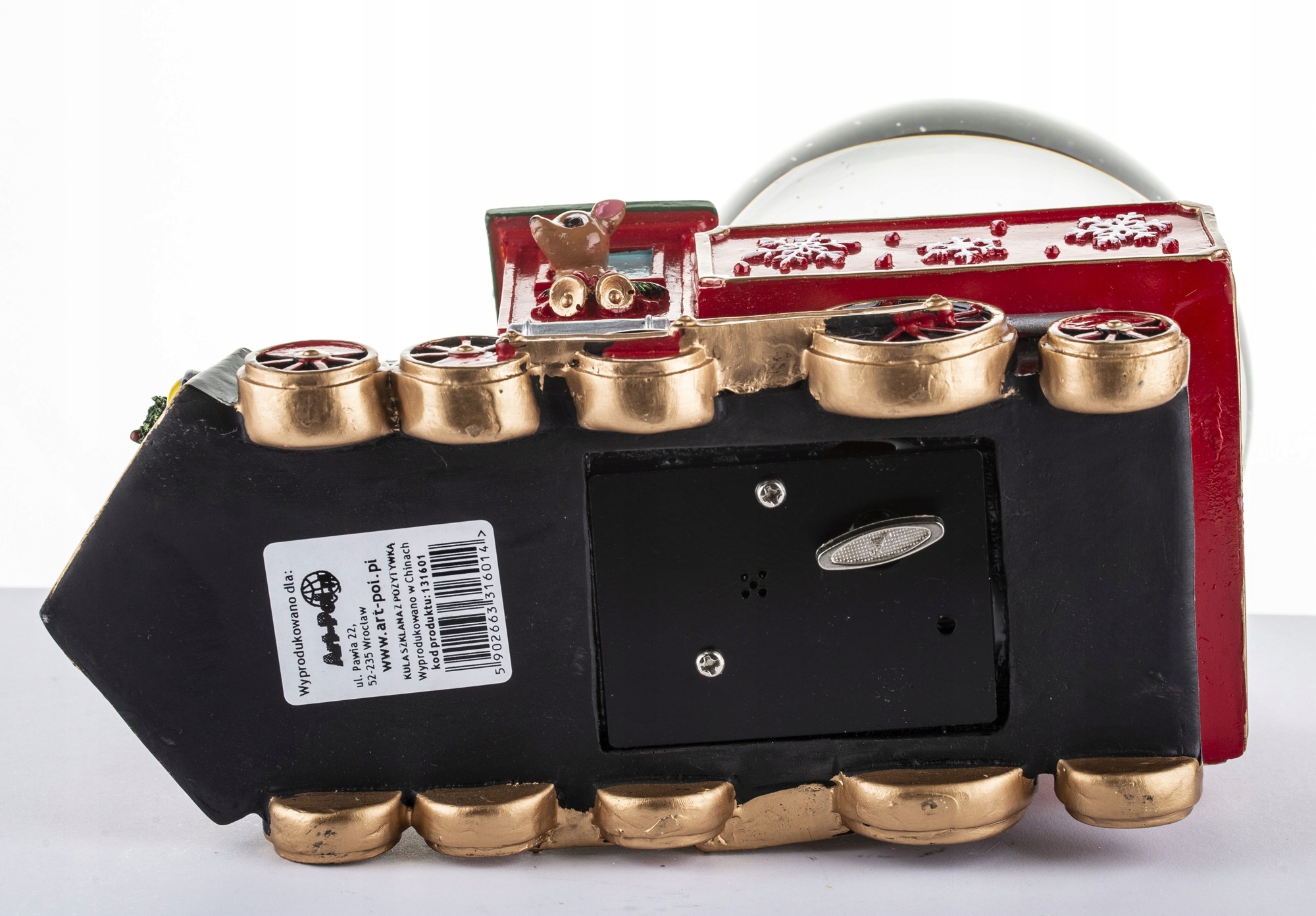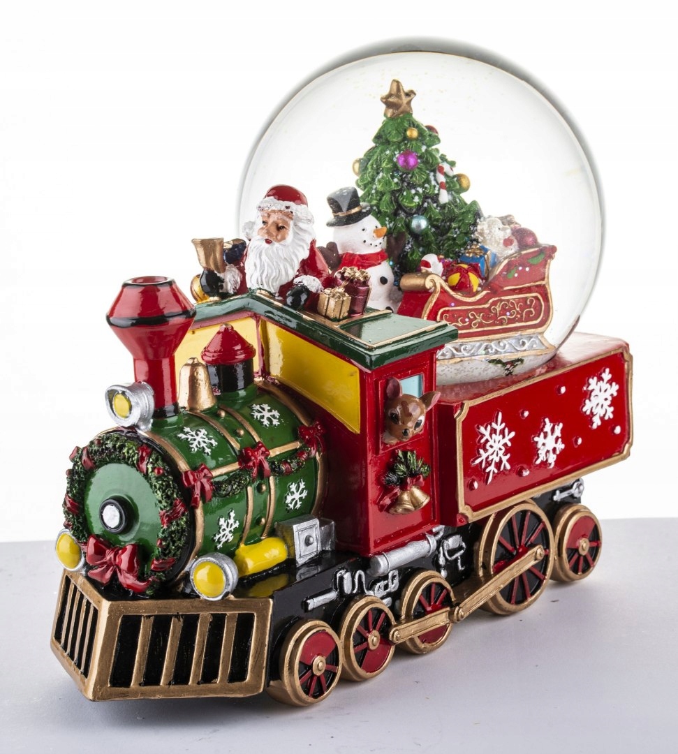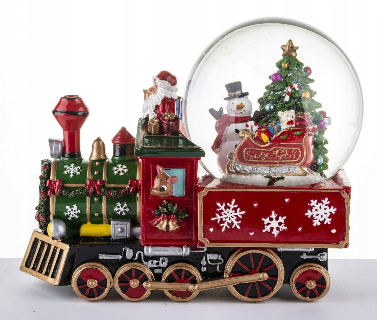 - Wyjątkowa Sceneria: Realistyczna, świąteczna scena z Mikołajem i lokomotywą wewnątrz kuli.