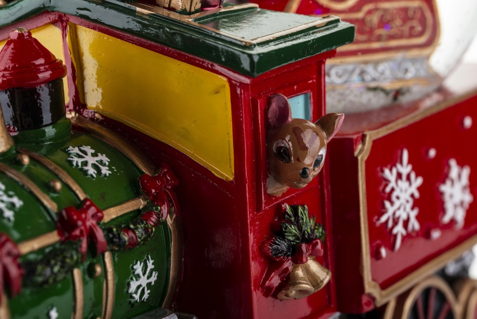Wewnątrz kryształowej kuli, na tle zaśnieżonego, zimowego krajobrazu, prezentuje się urocza kompozycja z Mikołajem i pociągiem. Po uruchomieniu pozytywki, scena ożywa: z głośników płynie ciepła, kojąca melodia „We Wish You a Merry Christmas”.