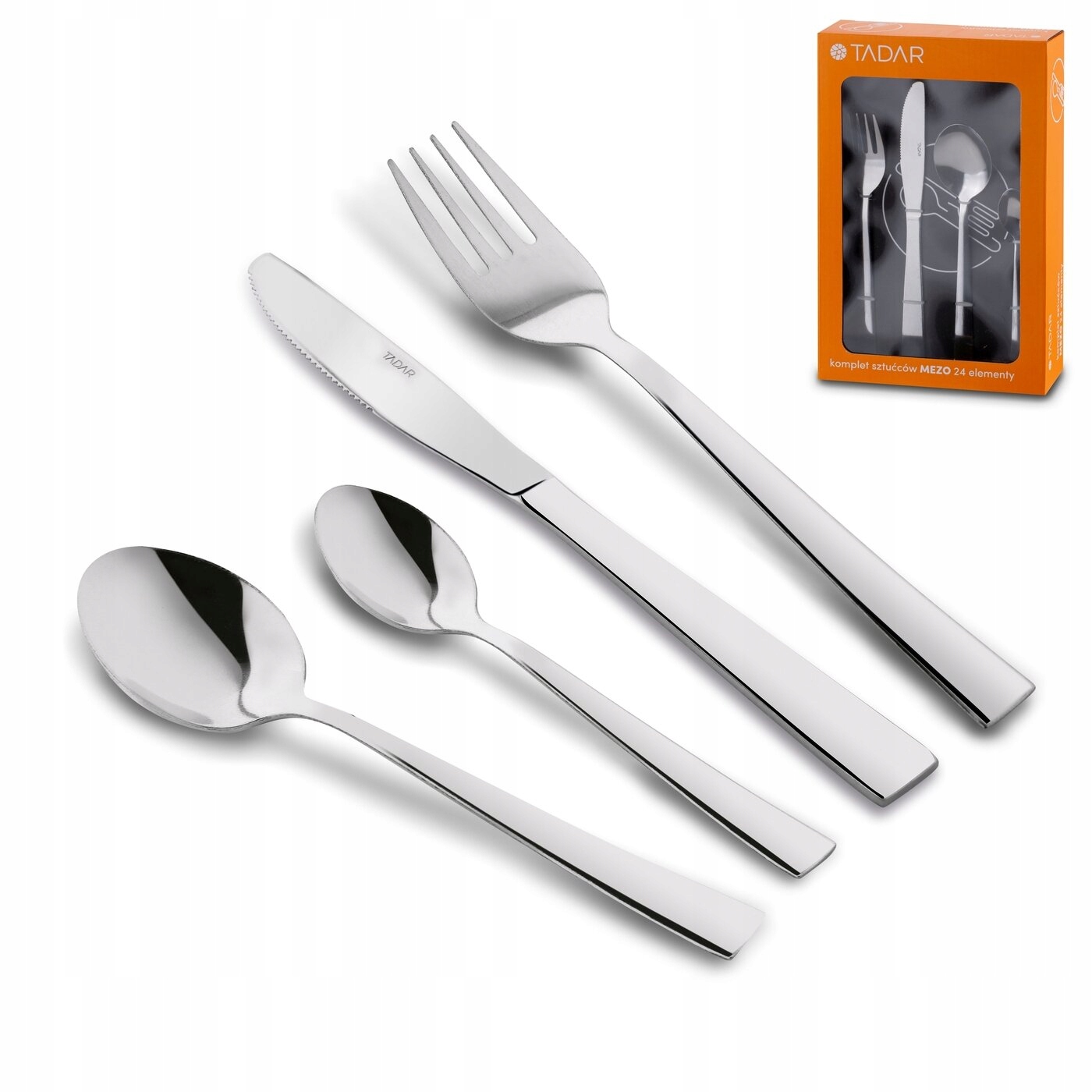 Komplet sztućców Tadar Mezo 24 elementy (widelce, łyżki, noże, łyżeczki) pozwala podać dania w eleganckiej oprawie. Dzięki trwałości stali nierdzewnej, będziesz się nimi długo cieszyć. Możesz wykorzystać ten komplet jako prezent. Smukły kształt pozwala wygodnie delektować się posiłkiem. Srebrne, błyszczące wykończenie będzie dobrze pasowało do każdego stylu zastawy. Wystarczy dla 6 osób. Umyjesz je w mgnieniu oka, także z pomocą domowej zmywarki. Z tymi sztućcami wszystko zjesz wygodnie – od zupy, przez drugie danie, aż po pyszny deser (ciasto, lody lub owoce z galaretką i bitą śmietaną).