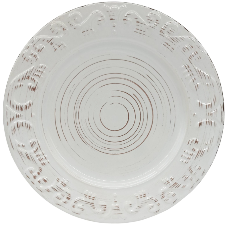 Jego kremowa, lekko przecierana powierzchnia, imitująca stylizowany efekt postarzenia, stanowi idealne tło dla wyrazistych, tłoczonych wzorów. Delikatne, spiralne kręgi na środku talerza oraz fantazyjne, symetryczne ornamenty biegnące wokół rantu, tworzą harmonijną kompozycję. Brązowe „przetarcia” podkreślają trójwymiarowość wzoru, nadając talerzowi głębi i niepowtarzalnego, ręcznie wykonanego charakteru.