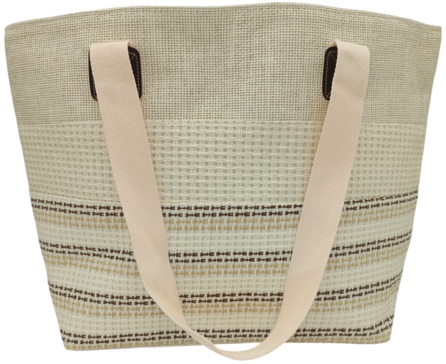 Torebka wykonana jest z wysokiej jakości, trwałego materiału o ciekawej, teksturowanej fakturze. Jej design wyróżnia się subtelnymi, poziomymi pasami w naturalnych odcieniach beżu, ecru i brązu, które nadają jej uniwersalnego i eleganckiego charakteru. To klasyka, która nigdy nie wyjdzie z mody i z łatwością dopasuje się do różnorodnych outfitów.