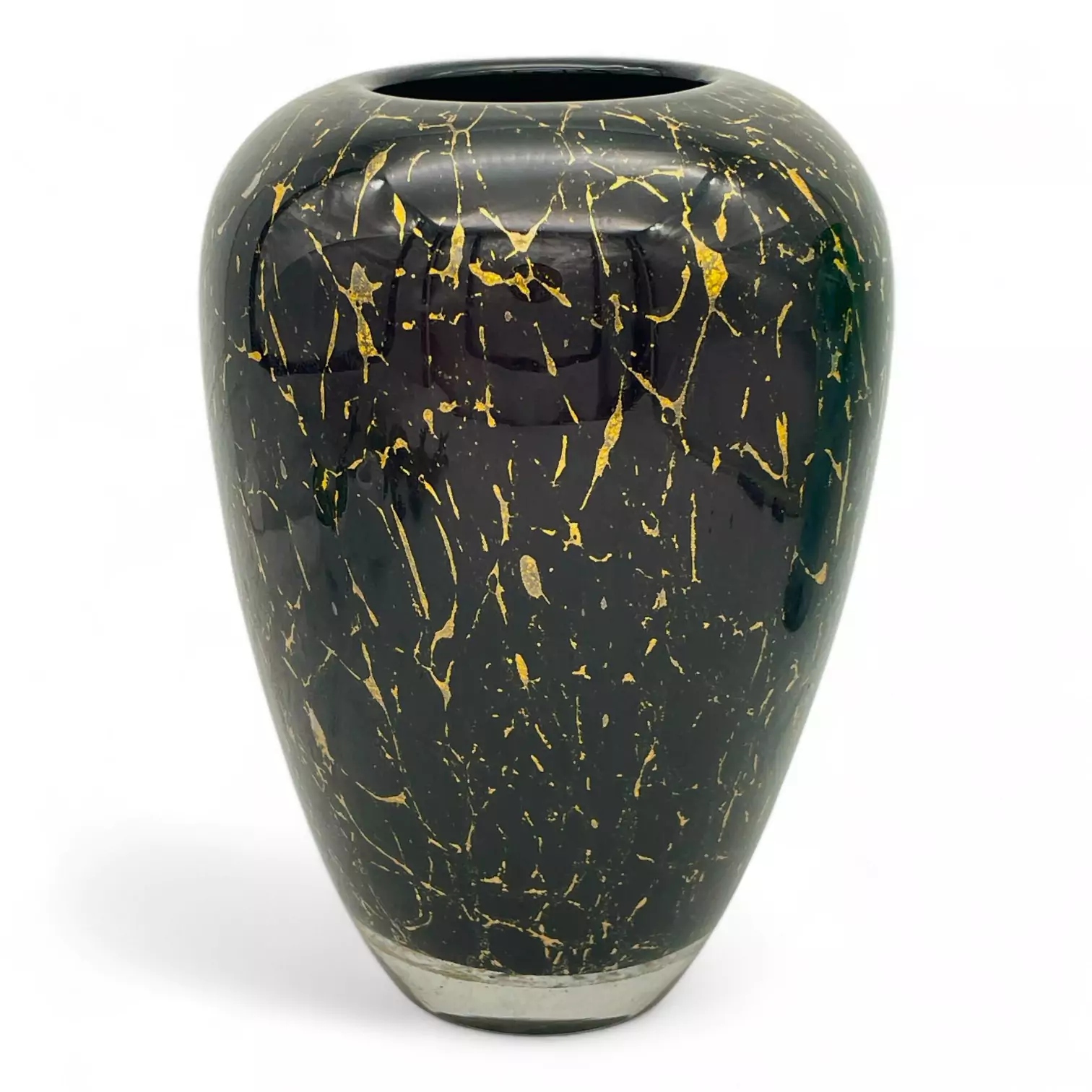 Ten piękny wazon charakteryzuje się intrygującym połączeniem głębokiej czerni z subtelnym, złotym wzorem typu „craquelure” lub „marmurek”. Efekt pękającej powierzchni w odcieniach złota tworzy niepowtarzalną teksturę i głębię, sprawiając, że wazon wygląda jak dzieło sztuki. Jego gładka, lśniąca powierzchnia pięknie odbija światło, podkreślając bogactwo wzoru.