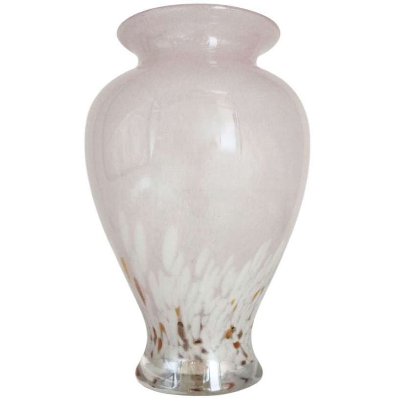 Ten wyjątkowy wazon charakteryzuje się delikatnym, pastelowym kolorem bladego różu, który został wzbogacony o intrygujący wzór: wtopione, mlecznobiałe i subtelne, złotawo-brązowe drobinki. Ten efekt tworzy na powierzchni szkła unikalną, niemal eteryczną teksturę, która pięknie rozprasza światło i nadaje wazonowi głębi. Jego gładka, lśniąca powierzchnia podkreśla szlachetność wykonania.