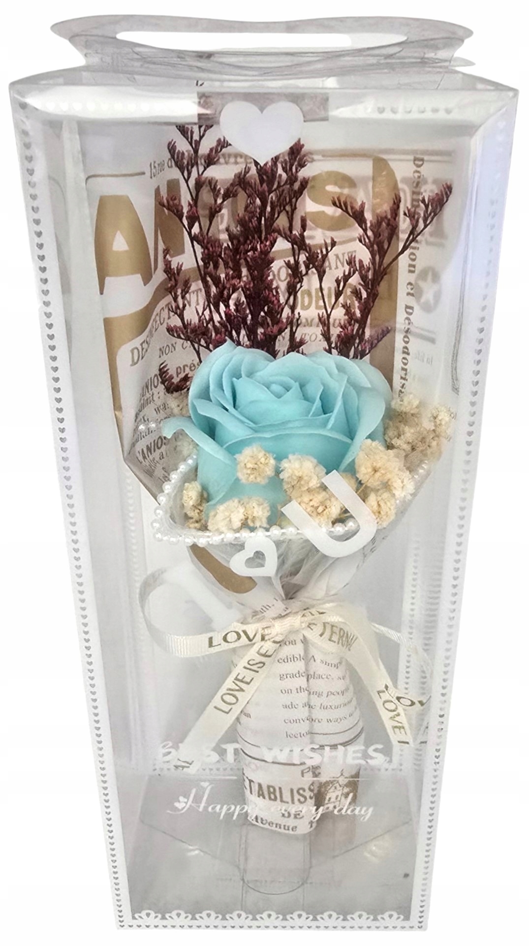 Wewnątrz transparentnego, dekoracyjnego pudełka z sercem na górze, znajduje się uroczy bukiet, którego sercem jest błękitna róża. Ten nietypowy kolor symbolizuje czar, marzenia i nadzieję. Kwiat otulony jest dodatkami z suszonych roślin i eleganckim papierem z nadrukiem. Całość ozdabiają delikatne perełki oraz romantyczna wstążka z napisem „LOVE” i zawieszką w kształcie serca, które podkreślają wyjątkowy charakter prezentu.