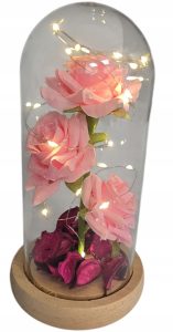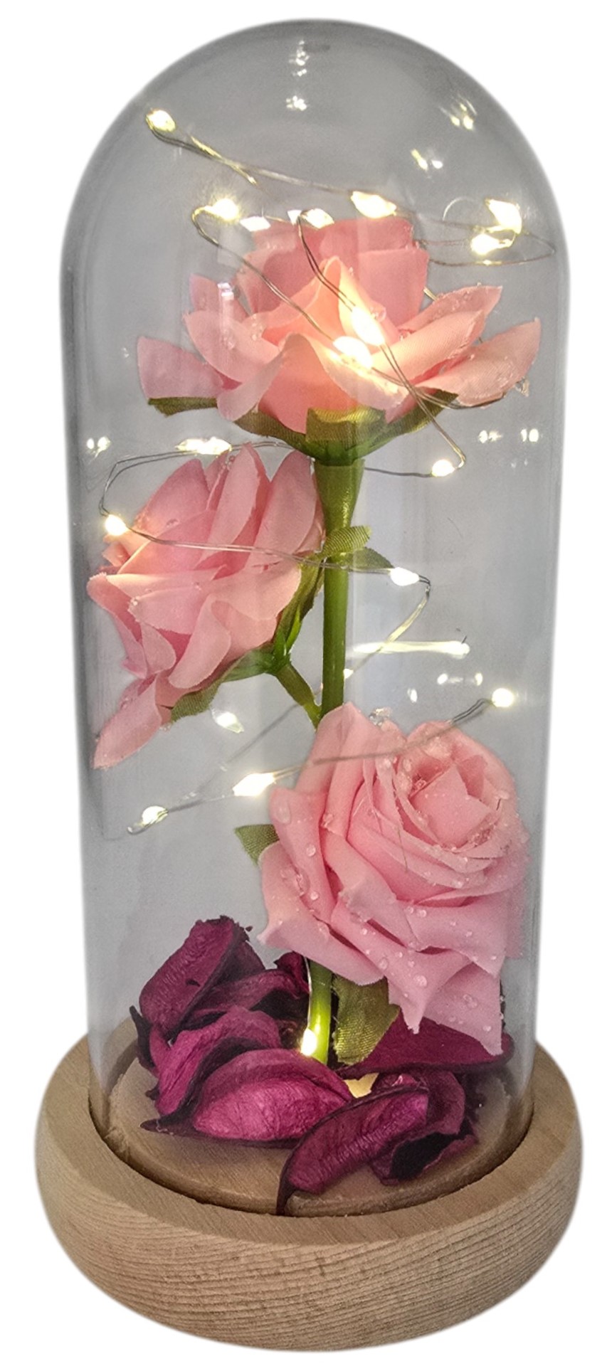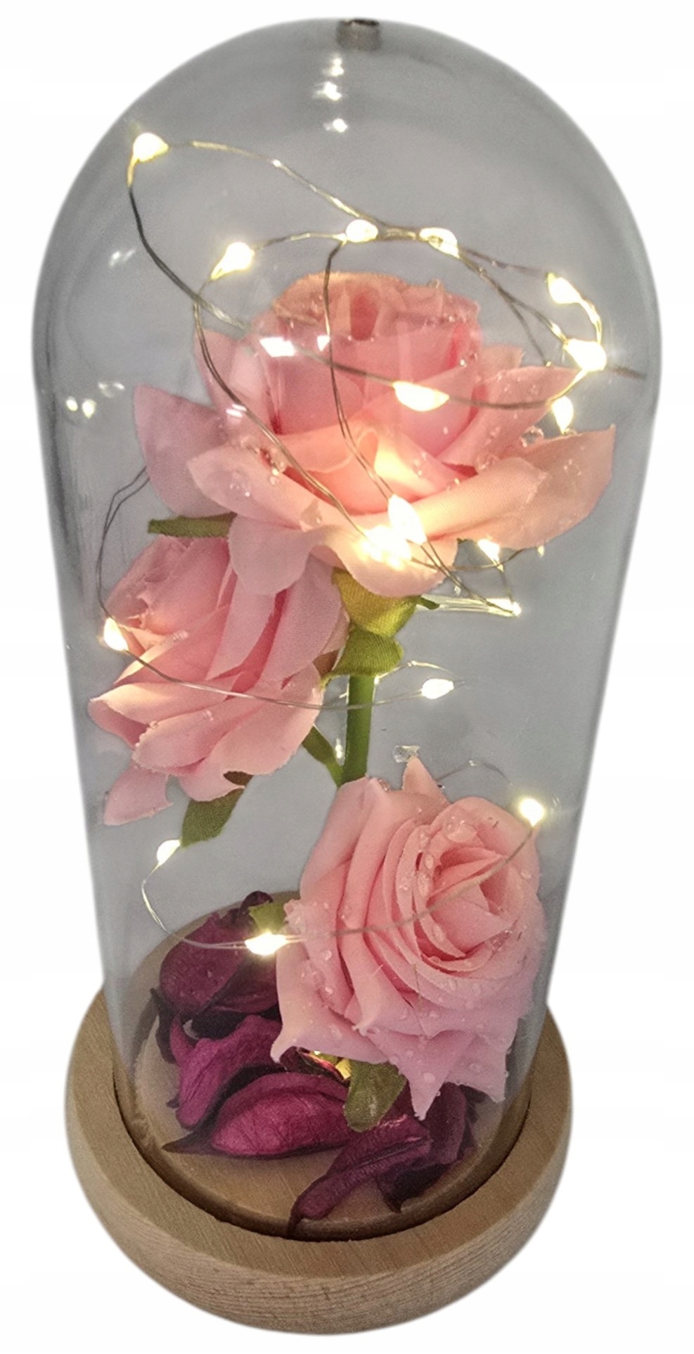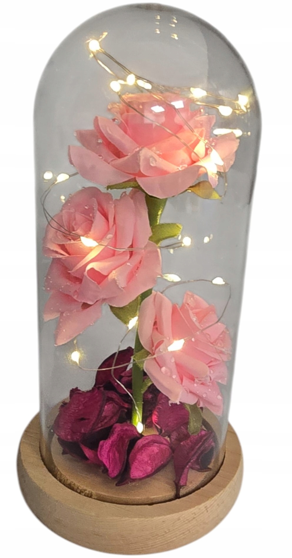 W kopule ukryta jest piękna róża, której płatki i łodyga mienią się. Różę otacza subtelne oświetlenie LED, które rozświetla ją ciepłym, magicznym światłem, tworząc niepowtarzalny nastrój. Całość została umieszczona na solidnej, drewnianej podstawie, co nadaje jej naturalnego i eleganckiego charakteru.