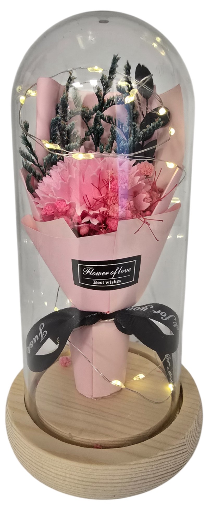 Całość rozświetlają ciepłe, miniaturowe lampki LED, oplatające bukiet niczym magiczne świetliki. Delikatne światło sprawia, że kwiat ożywa po zmroku, tworząc nastrojową atmosferę, idealną do sypialni, salonu czy biura. To nie tylko dekoracja, ale przede wszystkim trwały wyraz pamięci i sentymentu. Doskonały upominek na rocznicę, urodziny, Walentynki lub jako spontaniczny gest, który wyrazi więcej niż tysiąc słów.