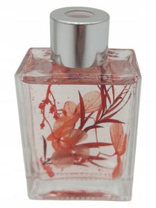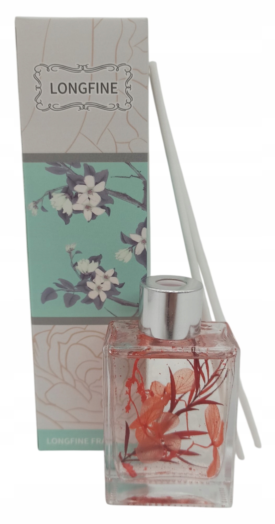 Nasz dyfuzor wyróżnia się unikatowym wzornictwem. W kwadratowej, szklanej buteleczce zatopione zostały kwiaty o pięknym, brzoskwiniowo-różowym odcieniu, które harmonijnie łączą się z klarownym płynem. Ta delikatna kompozycja kolorystyczna sprawia, że dyfuzor prezentuje się niezwykle stylowo i naturalnie. Srebrna nakrętka i eleganckie opakowanie z motywem kwiatowym idealnie dopełniają całości, tworząc produkt, który jest idealnym uzupełnieniem każdego wnętrza.