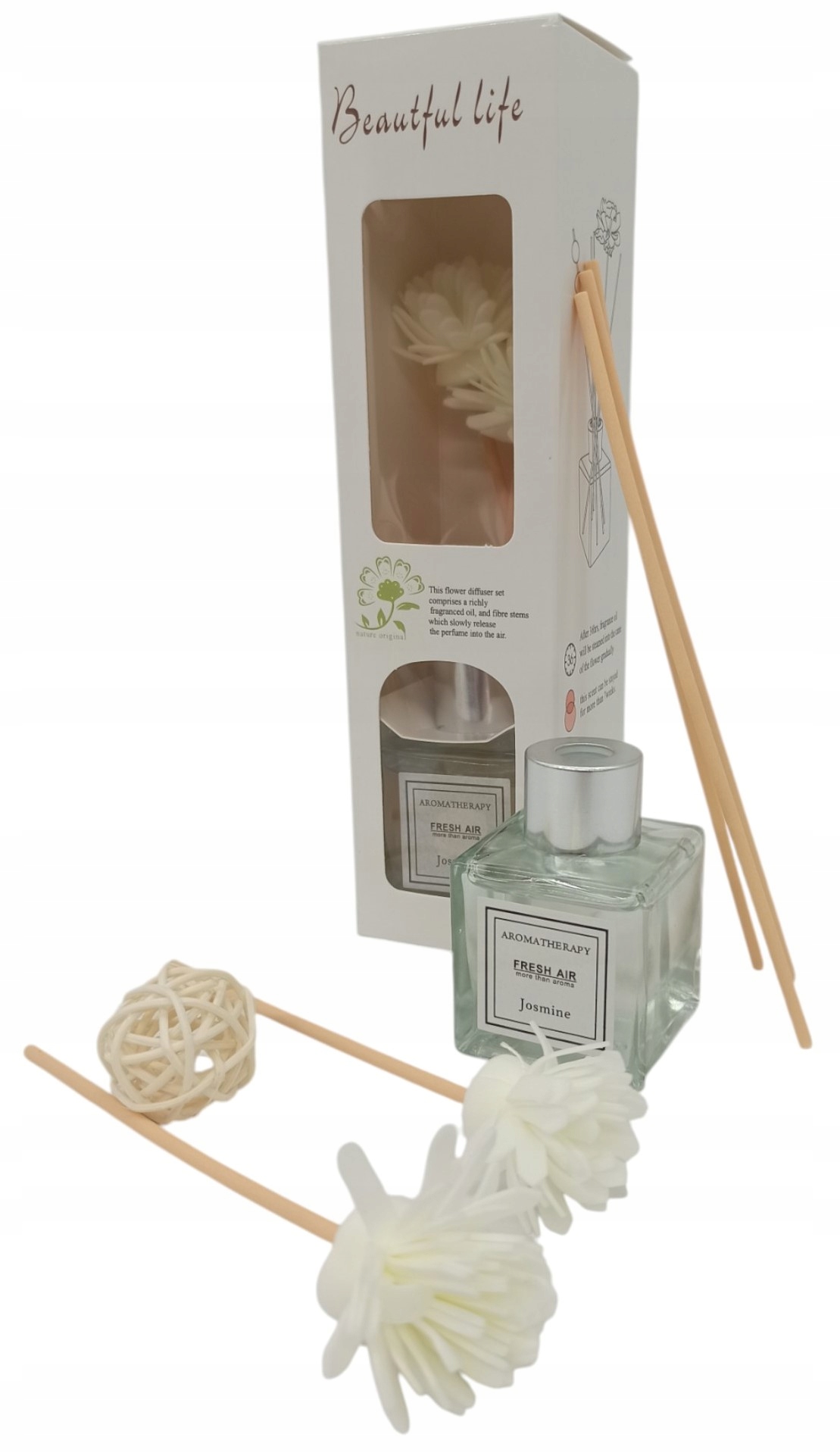 - Patyczki: Zestaw zawiera 4 sztuki naturalnych, drewnianych patyczków oraz 2 dekoracyjne patyczki (z kwiatami i rattanową kulą), które nie tylko rozprowadzają zapach, ale również stanowią ozdobę.