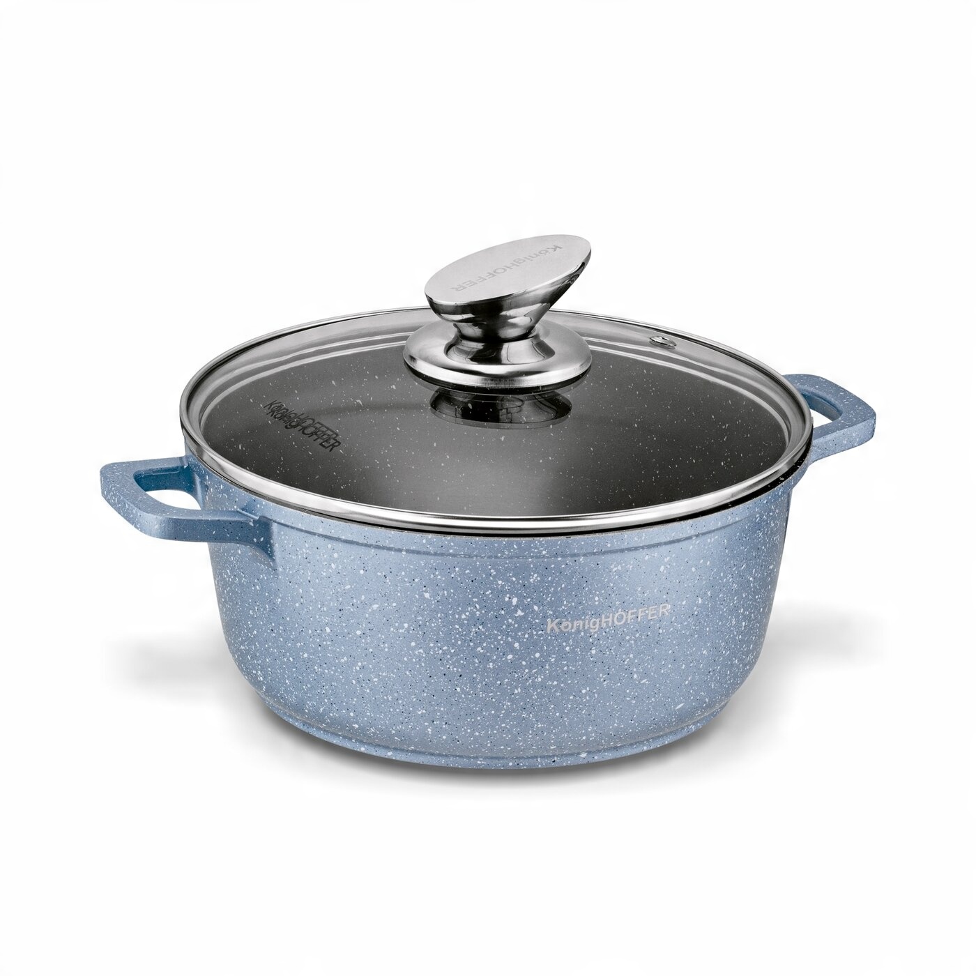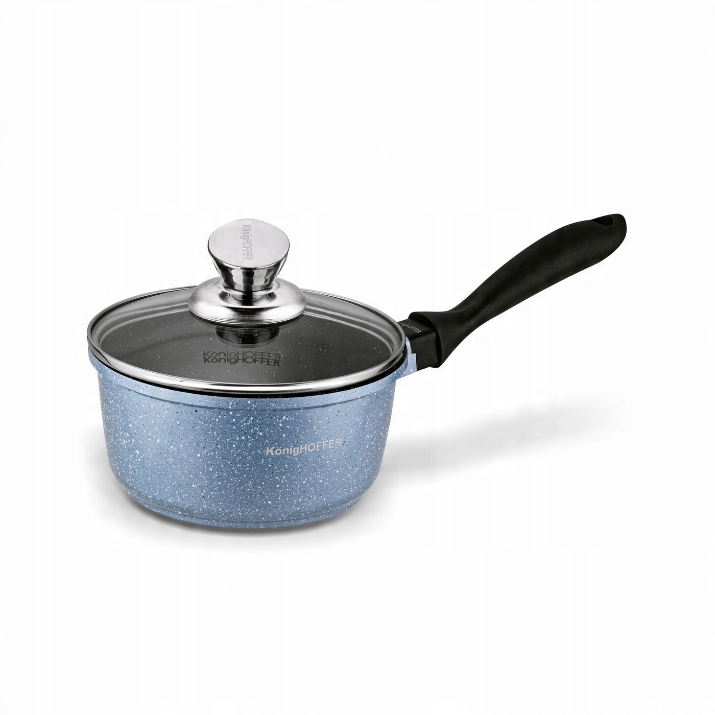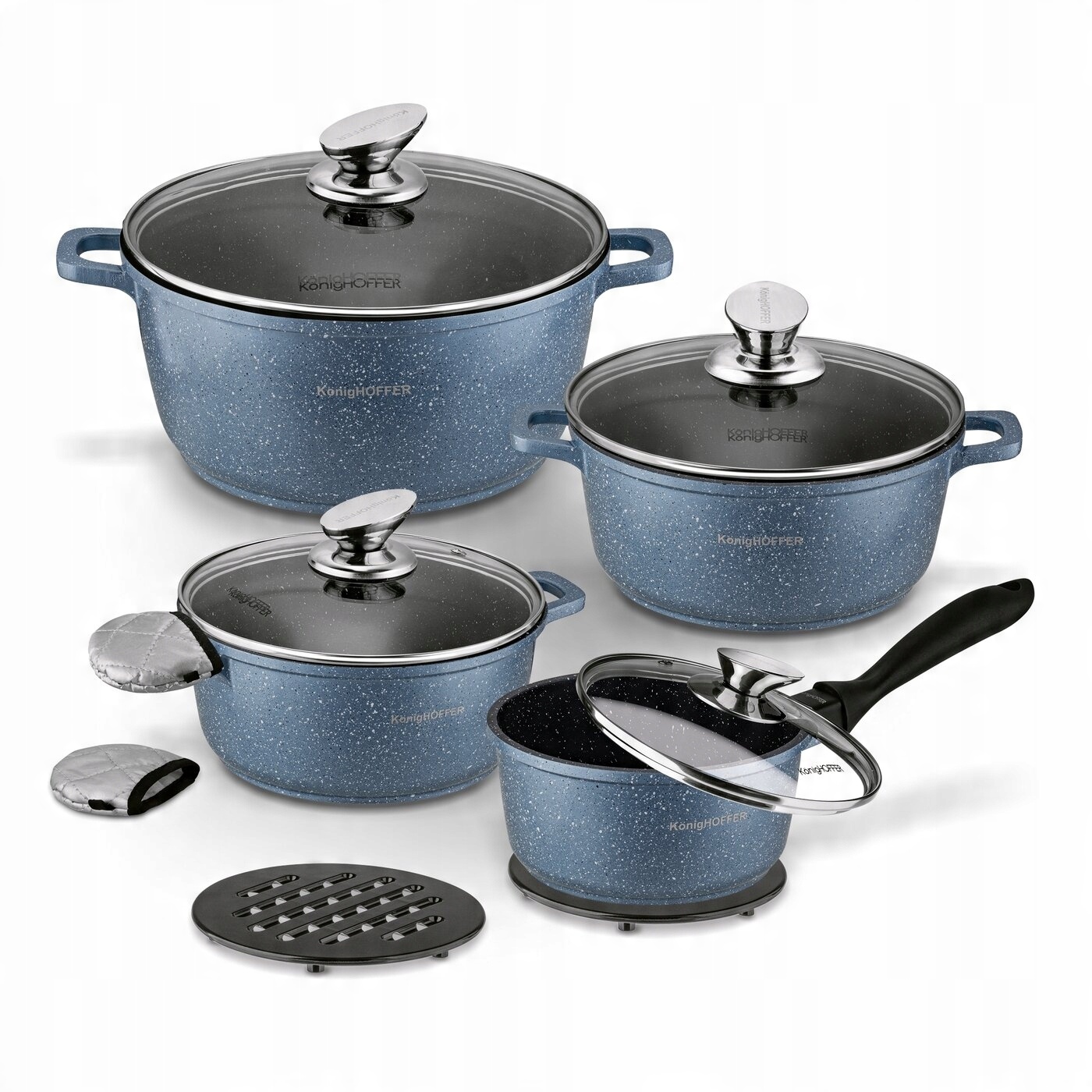 Zestaw garnków marmurowych Konighoffer Pollo Blue 8 elementów ma 2 materiałowe nakładki na uchwyty. Komplet pozwala więc na bezpieczne gotowanie i smażenie, zmniejszając ryzyko oparzenia dłoni. W zestawie znajdziesz naczynia o pojemności od 1,2 do 4,5 litra. Do garnków i rondla dołączono szklane pokrywki ze stalowym rantem, chroniącym przed wyszczerbieniem. Mają one również stylowe, nierdzewne uchwyty. Z kompletem garnków Pollo typu stone możesz gotować na każdym typie kuchenki. Elegancji dodaje mu granitowa powłoka nieprzywierająca oraz wykończenie aluminiowych korpusów stylizowane na marmur. Nagrzewają się szybko, a więc oszczędzisz czas i energię. Świetnie sprawdzą się w rodzinnej kuchni lub jako prezent. Są też dobrze zabezpieczone przed wysoką temperaturą i równomiernie przewodzą ciepło. Masz również możliwość użytkowania garnków (nie rondla!) w piekarniku maksymalnie w 220 st. C. O ich bezpieczeństwie użytkowania oraz nietoksycznej konstrukcji dla środowiska stanowi oznaczenie PFOA Free. Aby nie uszkodzić stołu lub blatu kuchennego wystarczy wykorzystać 2 podkładki pod gorące naczynia znajdujące się w zestawie. Rączka rondla jest wykończona tworzywem soft touch. Dzięki temu nie ślizga się w dłoni i nie nagrzewa się, a także jest przyjemna w dotyku. Produkt ma rekomendację Ewy Wachowicz. Jako ambasadorka marki Konighoffer, gorąco i z uśmiechem poleca go ona do domowego użytku. Razem z nim zdobędziesz twój przepis na dom. To jedna z najlepszych opcji w tej kategorii!