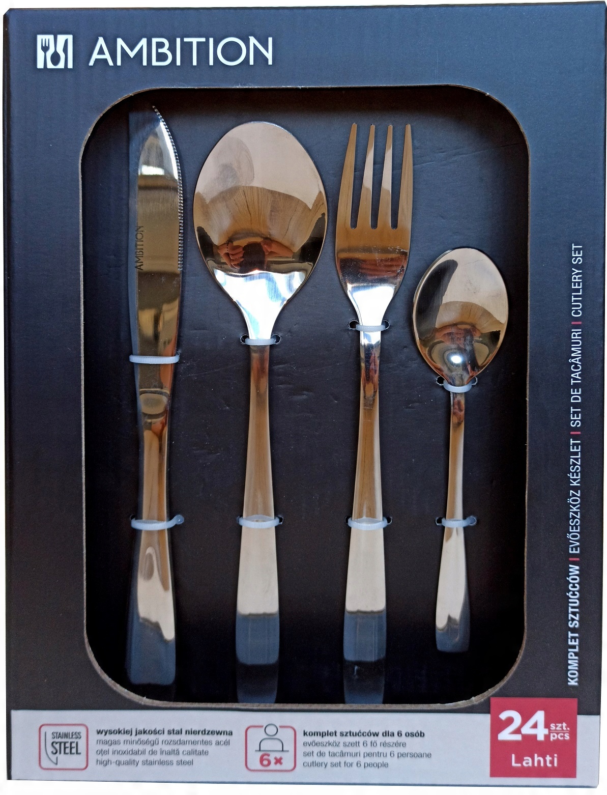 Zestaw sztućców marki Ambition na 6 osób, składający się z 24 elementów. Linia Lahti to polerowane sztućce o lustrzanym wykończeniu i klasycznym kształcie. Smukła rękojeść oraz delikatne wzornictwo sprawia, że kolekcja ta jest jedną z najchętniej wybieranych przez klientów. Sztućce wykonano z wysokiej jakości stali nierdzewnej.